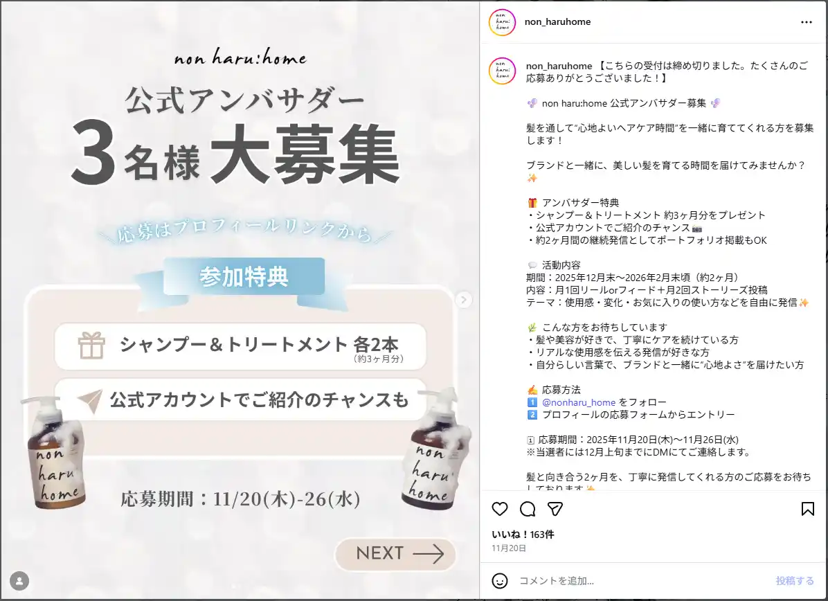 (参考)non haru:home 第一期アンバサダー募集情報 |