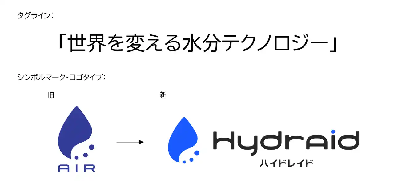 「Hydro(水分)」と「Aid(回復を助ける)」を組み合わせた「Hydraid(ハイドレイド)」には生命の源である水の技術で様々なモノや環境が本来のポテンシャルを発揮できるように導きたいという思いが込められています。 |
