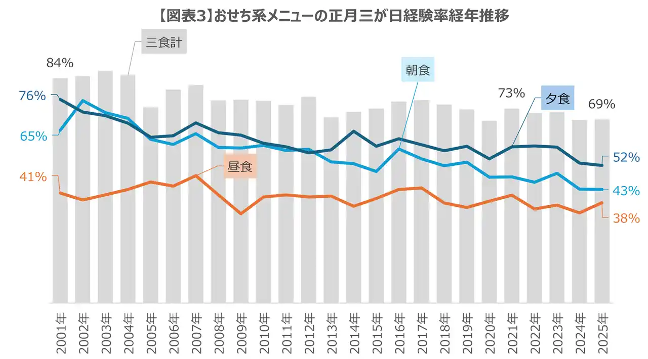 【図表3】分析対象:家族世帯,分析期間:2001~2025年 1/1~3(正月三が日),食卓機会:三食計、朝食、昼食、夕食,分析メニュー:おせちメニュー,指標:分析メニュー経験世帯率 |
