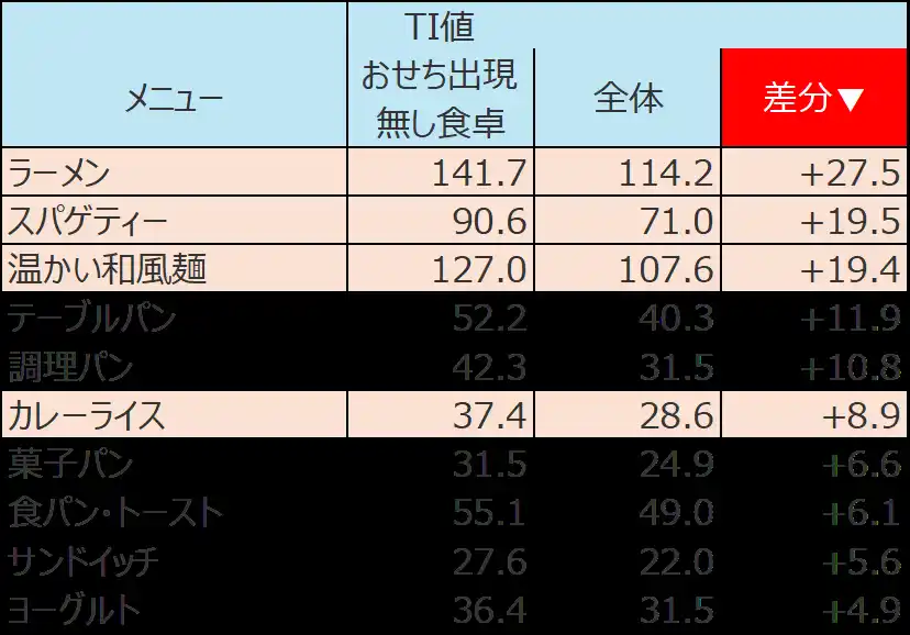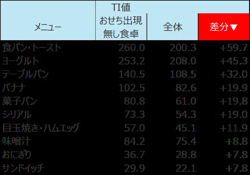 【図表4】分析対象:家族世帯,分析期間:2023~2025年 1/1~3(正月三が日),食卓機会:朝食,指標:TI値(1000食卓あたりの出現回数)、TI値差分 |