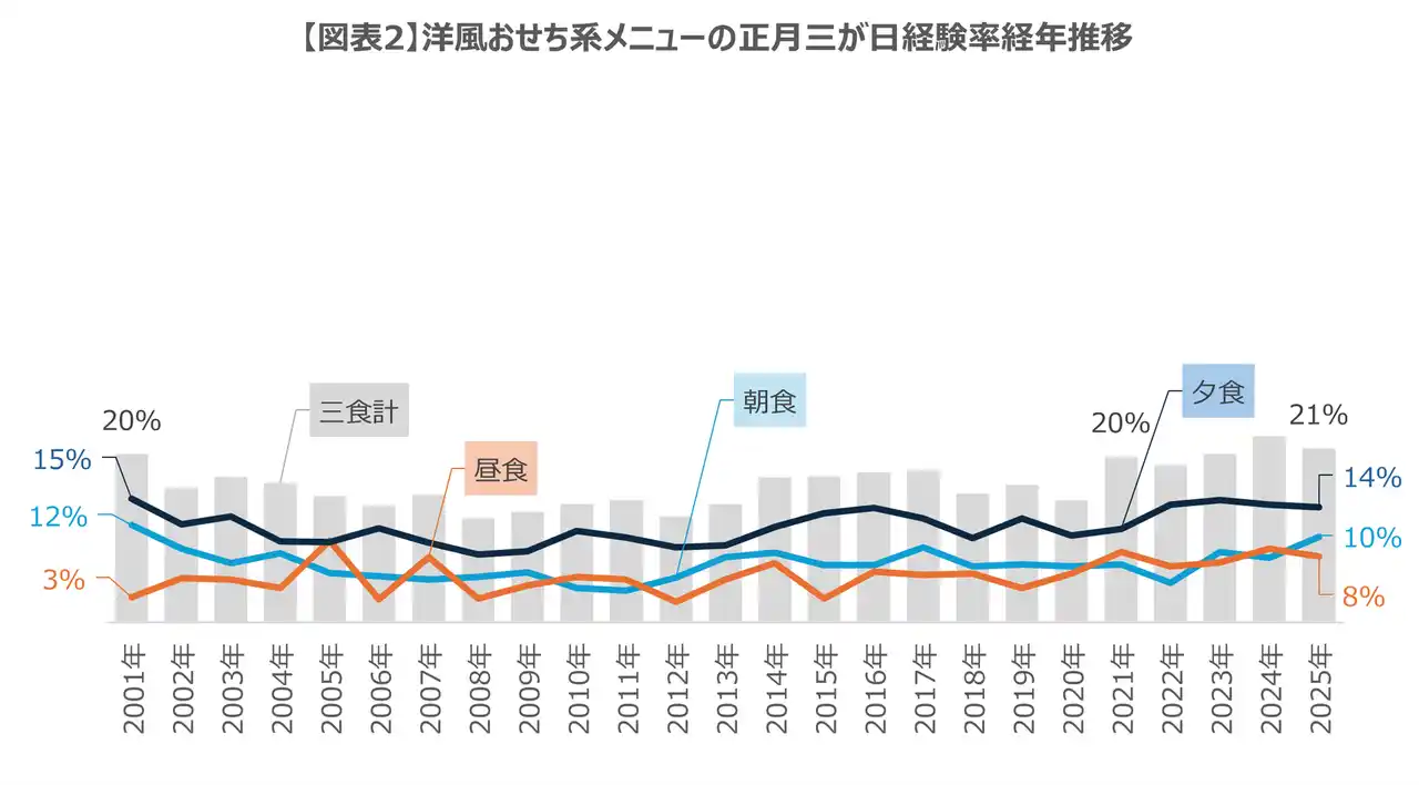 【図表2】分析対象:家族世帯,分析期間:2001~2025年 1/1~3(正月三が日),食卓機会:三食計、朝食、昼食、夕食,分析メニュー:おせちメニュー(洋風),指標:分析メニュー経験世帯率 |