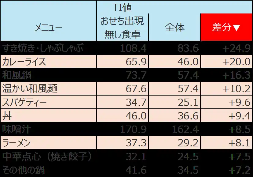 【図表6】分析対象:家族世帯,分析期間:2023~2025年 1/1~3(正月三が日),食卓機会:夕食,指標:TI値(1000食卓あたりの出現回数)、TI値差分 |