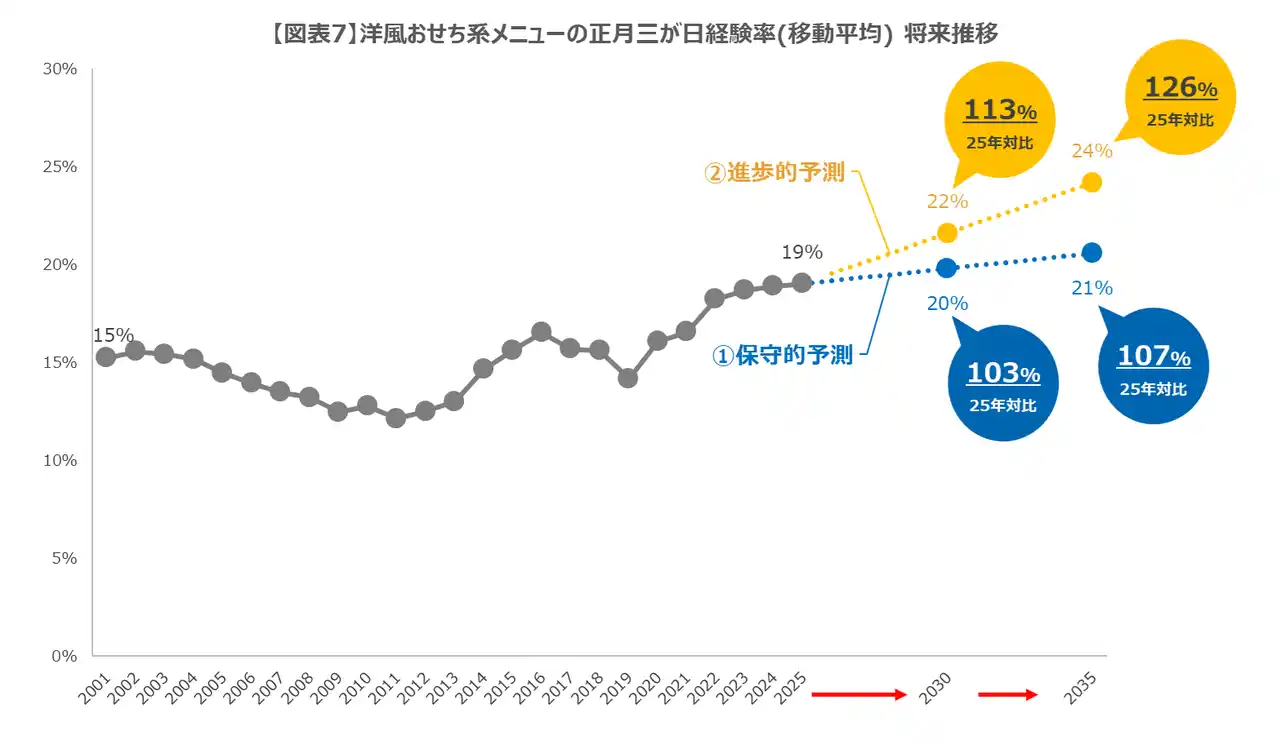 今回分析した洋風おせち経験世帯率は、2025年比で5年後の2030年に103%~113%、10年後の2035 年に2025年比107%~126%と増加の予測です。 |