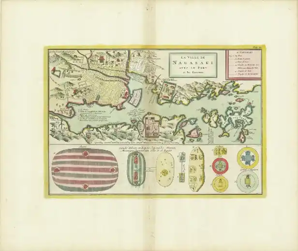 本企画展の象徴的な展示資料として、ヨーロッパ製と日本製の2枚の長崎湾図を対比させたデザインです。異なる視点から描かれた2枚の地図は、肥前国と世界の繋がりを鮮やかに浮かび上がらせます。地図に込められた歴史の物語をぜひお楽しみください。 |