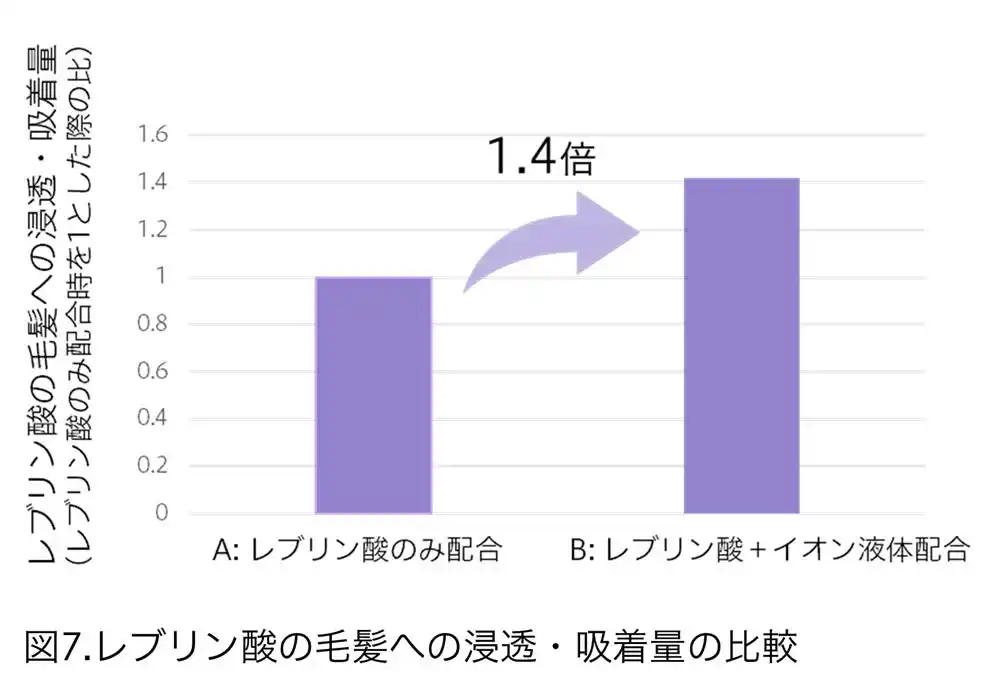 その結果、イオン液体を併用した場合、レブリン酸の毛髪への浸透量・吸着量がレブリン酸のみに比べて1.4倍増加していることが確認されました(図7)。これにより、イオン液体の吸着・浸透促進効果が示されました。 |