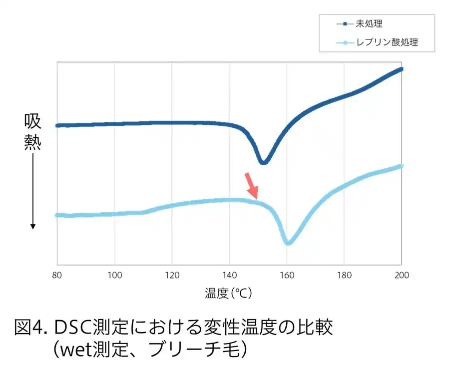 次に、レブリン酸を処理した毛髪と未処理の毛髪についてDSC測定を行いました。その結果、レブリン酸を処理した毛髪では、変性温度が高くなることが確認できました(図4)。これは、レブリン酸が毛髪内部に浸透することで架橋密度が高まり、毛髪内部の組織間の接着性が向上し、熱に強い状態に変化したためと考えられます。 |