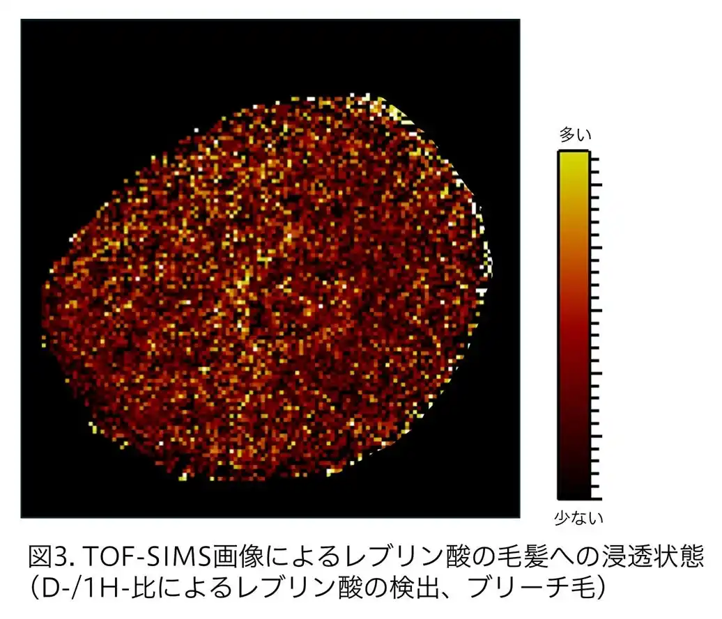 レブリン酸の毛髪への作用を明らかにするために、まずレブリン酸の毛髪への浸透状態を確認しました。ブリーチを施した毛髪に重水素で目印を付けたレブリン酸を処理し、TOF-SIMS測定※5を行った結果、レブリン酸は毛髪内部全体に浸透していることが確認できました(図3)。 |