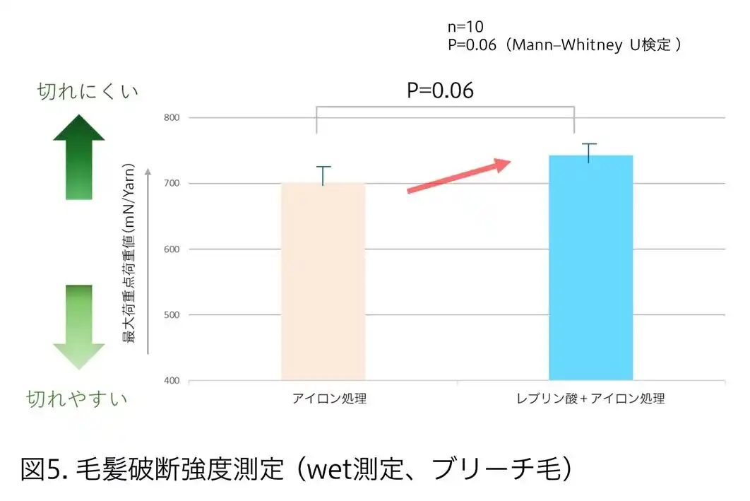 さらに、ブリーチ毛に対し、「ヘアアイロン処理」、「レブリン酸処理後にヘアアイロン処理」した毛髪の毛髪破断強度を比較しました(図5)。「レブリン酸処理後にヘアアイロン処理」した毛髪は、「ヘアアイロン処理」した毛髪と比較して毛髪破断強度が上昇することが分かりました。 |