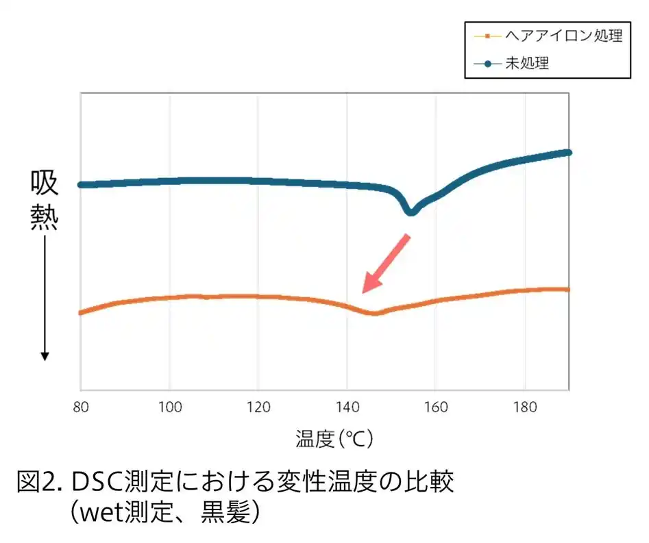 次に、DSC測定(示差走査熱量測定)※3による、毛髪内部の構造が変化/崩壊する温度帯(変性温度)を確認したところ、ヘアアイロンを使用した毛髪では、変性温度が低下していることが分かりました(図2)。このDSC測定における変性温度の低下は、毛髪内部の架橋密度が低下することを示唆しています。 |