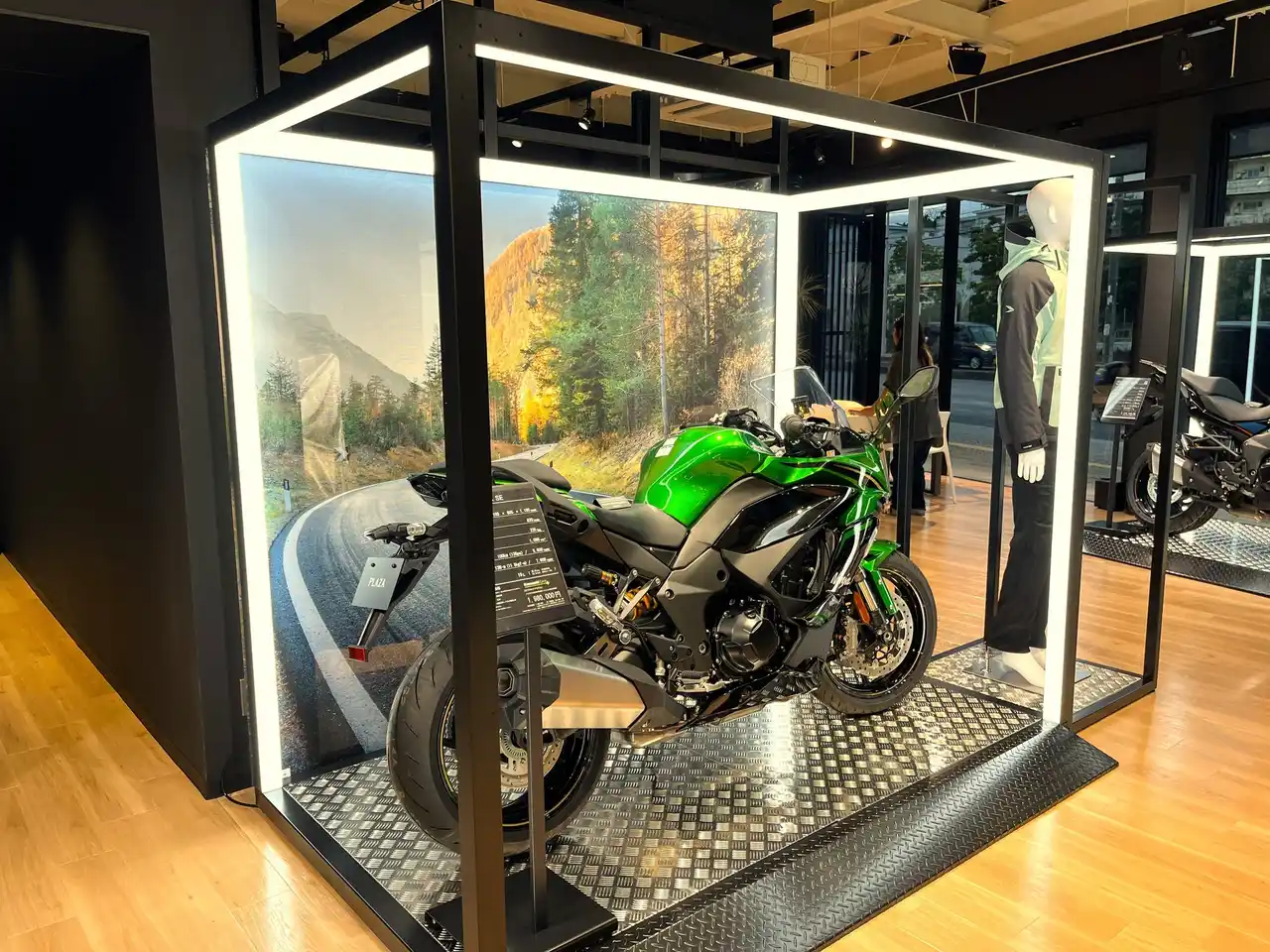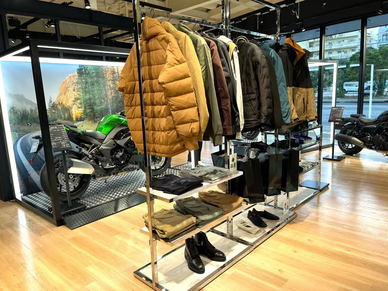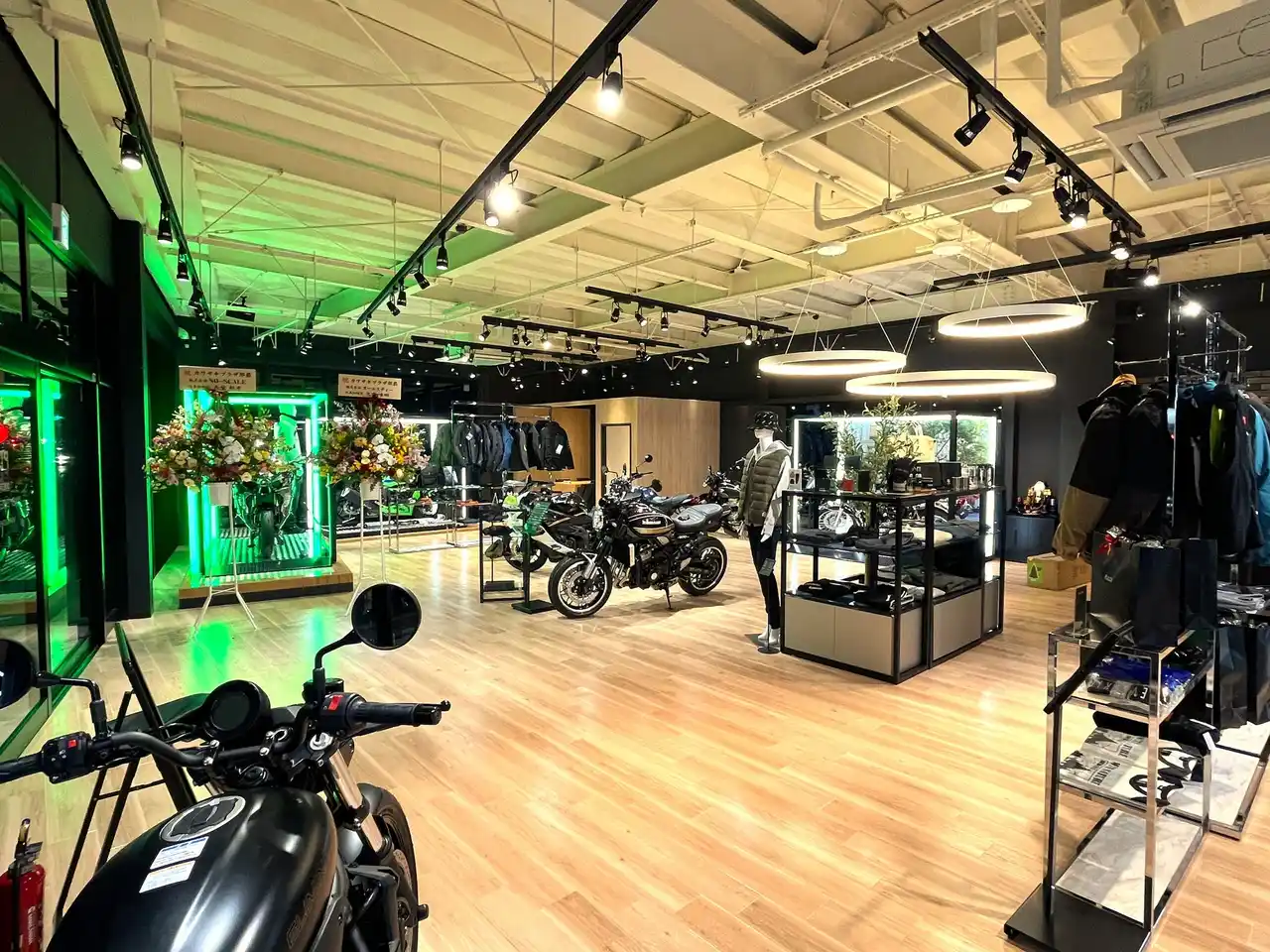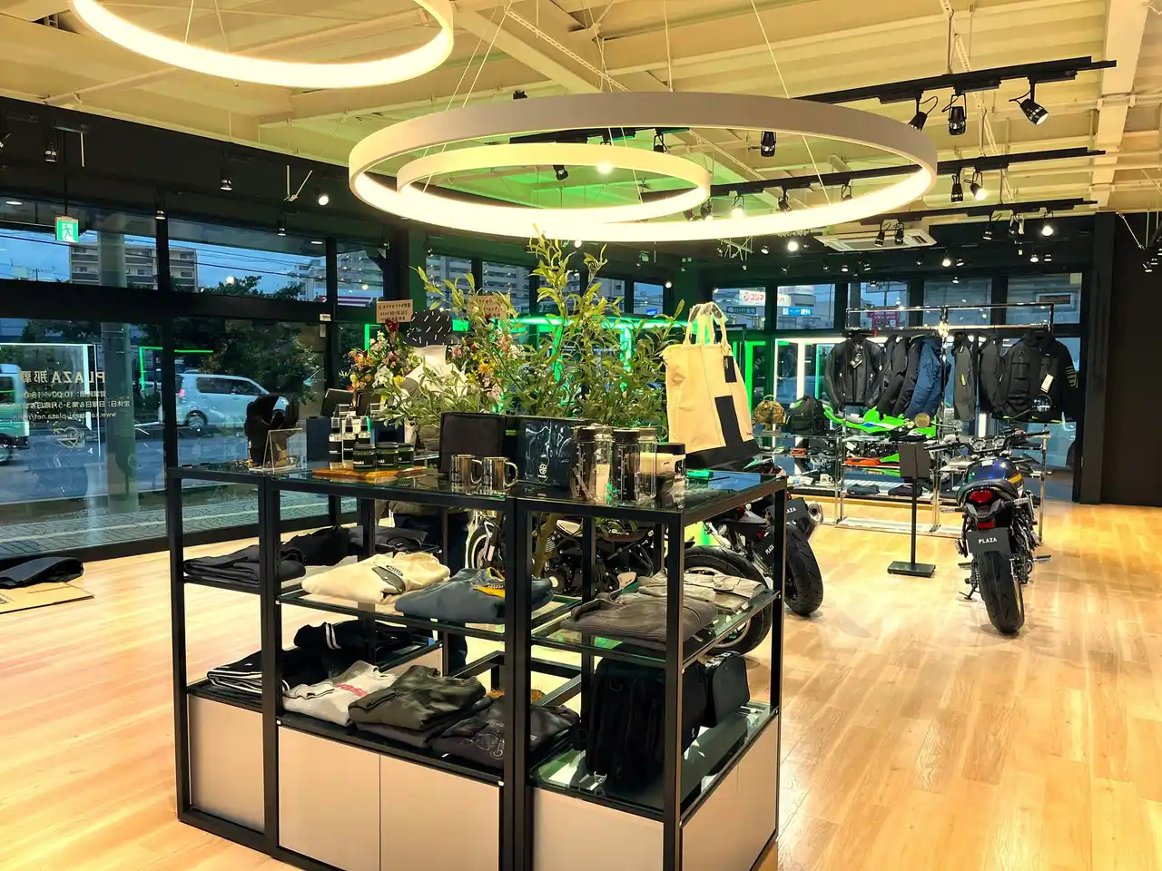 | 木目調のフロアと白い天井が織りなす明るい店内。モーターサイクルとプラザアパレルがゆったりと展示され、どなたでも楽しめる空間となっています。 | ||||||||||||