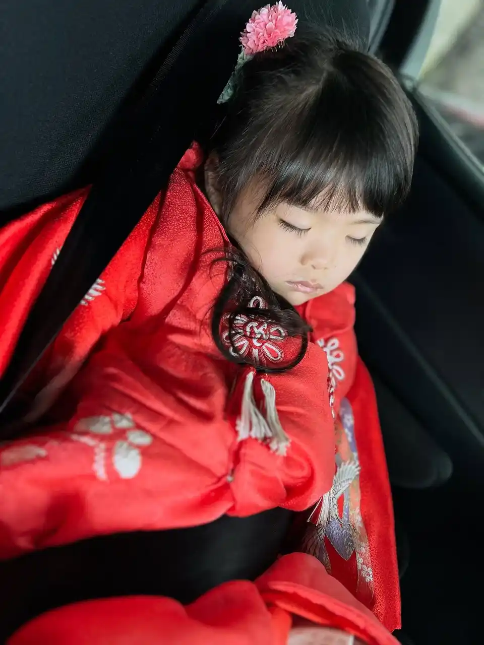 神社に行くまでの車の中で、すやすや眠ってしまった娘 |