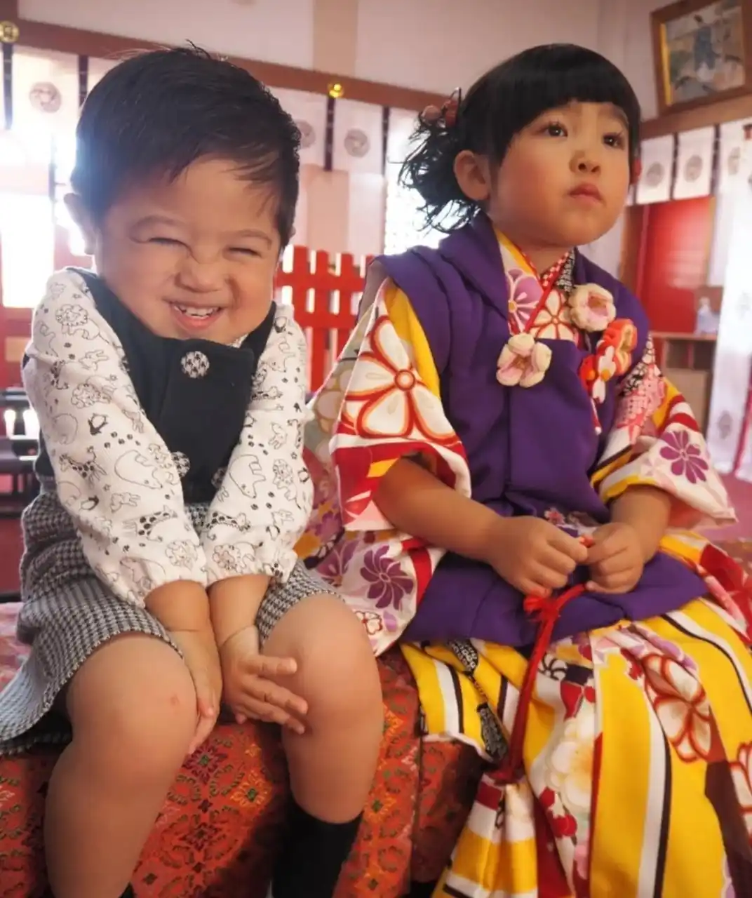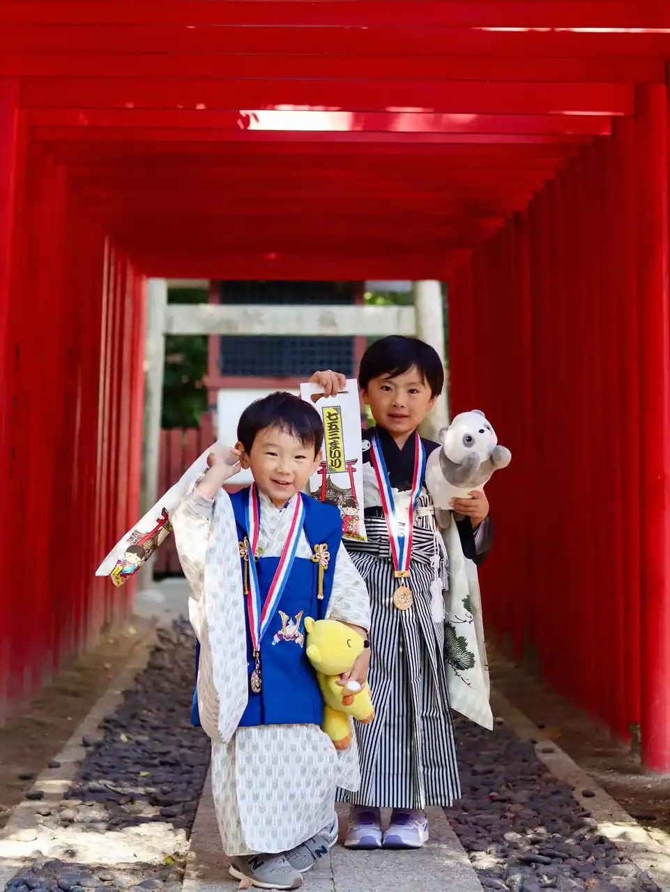 大安の昨日、七五三のお詣りへ 無事にこの日を迎えられて嬉しい 兄弟同時の七五三で本当に大変だった! とりあえず2人とも着物を着てくれただけで花マル 次男がお気に入りのキツネのぬいぐるみ持ってくー!と言い出し、 そうするとお兄ちゃんもパンダのぬいぐるみ持ってくー!と(笑) 今まで一度も外に持って行ったことないのに、(←ここポイント) なぜこのタイミングで けど機嫌を損ねないことが最優先なので採用◎ 3歳と5歳でまぁまぁな大きさのぬいぐるみと撮影するという 見返すと面白い写真になりました もちろん家族の集合写真にもちゃんと写ってます |
