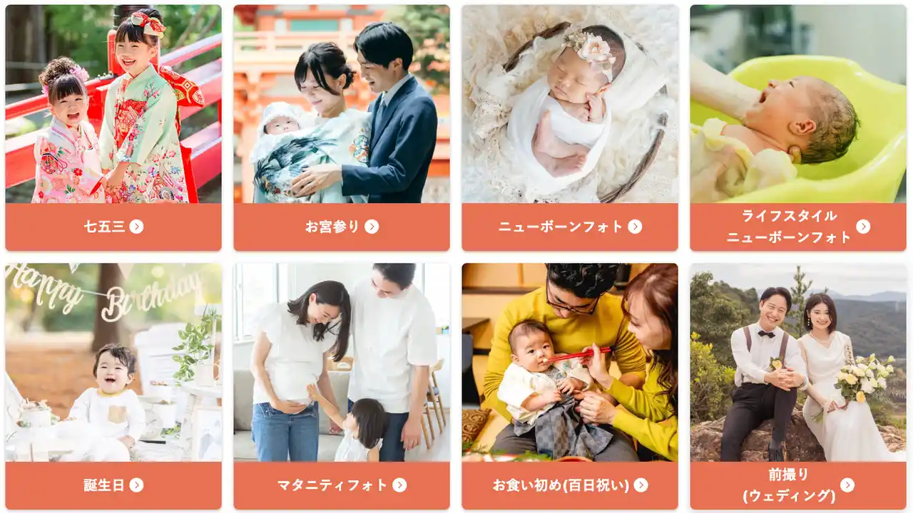 マタニティ、ニューボーン(新生児)、お宮参り、誕生日、七五三、卒入園・卒入学、成人式、結婚式の前撮り・後撮り、長寿祝いなど、ご家族の記念日はもちろん、日々の残したい愛おしさに寄り添う「わが家の専属フォトグラファー」として、全国のご家族にご利用いただいています。 |