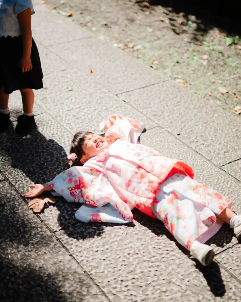 延期して迎えた快晴の七五三日和。着物もヘアセットも完璧で、ご機嫌に神社へ到着しました。 祈祷も撮影も順調に進むと思った瞬間、「あー!気持ちー!!!」と叫んで、地面にゴロン。 日当たりが最高で、気持ちよすぎて寝転んでしまった瞬間の1枚です。 |