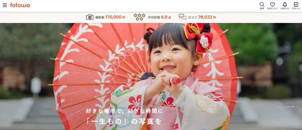 「fotowa」は、撮影して欲しい人とプロのフォトグラファーをつなぐ、家族・子ども向けの出張撮影プラットフォームです。シンプルな料金設計と、好きな場所に好きな作風のフォトグラファーを指名して撮影予約ができるのが特徴。 |