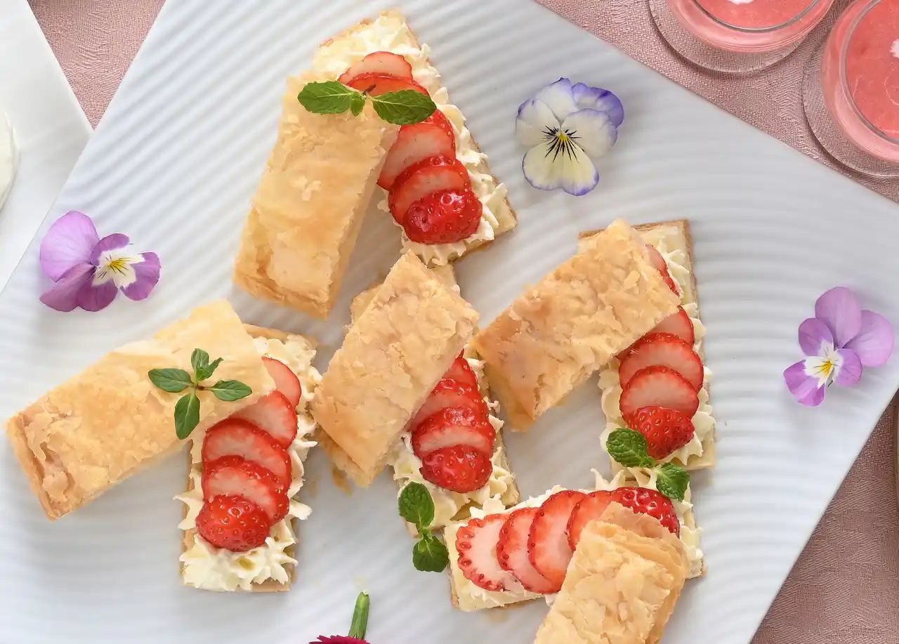 また、目の前で仕上げる“ライブデザート”では「イチゴのミルフィーユ」を提供。サクサクの生地と優しい甘さのカスタードに苺のフレッシュな香りと酸味が調和します。 |