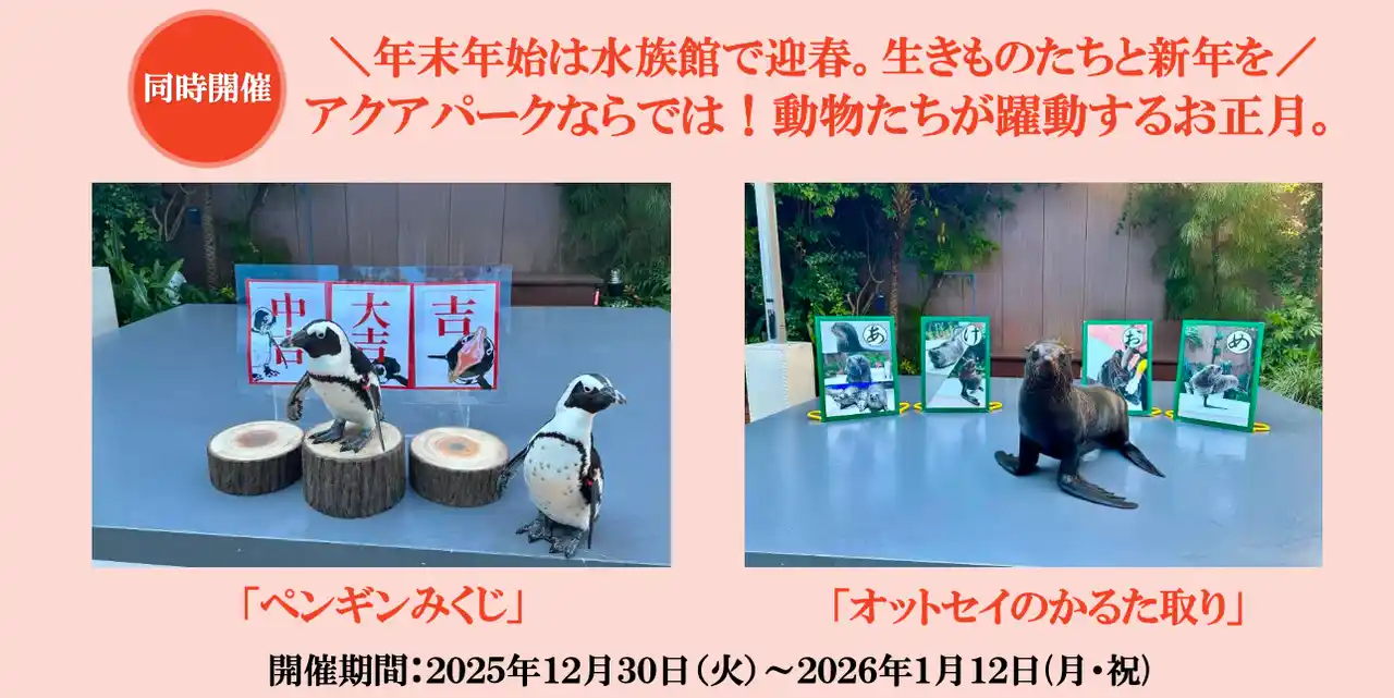 そして、年末年始の特別な時間を楽しむ機会として、「スノウアクアリウム」に加え、お正月コンテンツと特別プランもご用意!「フレンドリータイム」では“かるた取り”をテーマにしたオットセイの生態紹介や、丸太の“おみくじ”をペンギンたちが選び、新年の運勢を占うとともに豆知識も楽しめるプログラムなど、お正月感あふれる内容でお届け!閉館後の特別プランでは、穏やかな夜の水族館を人数限定でゆったりと満喫いただけます。 |