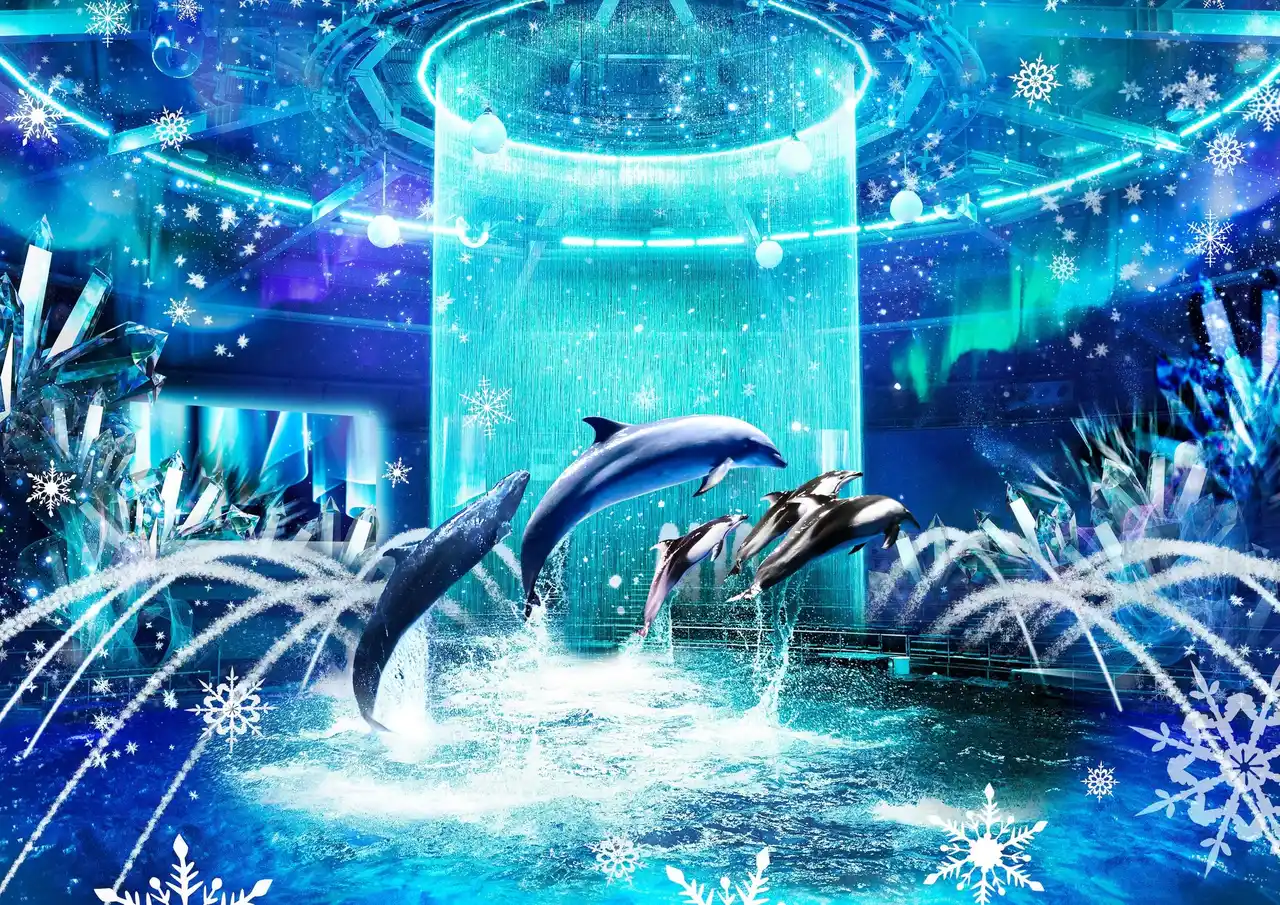 MCを入れず、【水(噴水、ウォーターカーテン)】・【光(ムービングライト、水中照明)】・【映像(プロジェクションマッピング、LEDビジョン)】・【音(12.1chサラウンド)】などのデジタルテクノロジーを用いた演出のみで展開するナイトプログラム。目の前に広がる、神秘的なブルーに染まった“海”では、壮大な楽曲に合わせてイルカたちがダイナミックな躍動を披露。その動きと連動し、客席をぐるりと囲むようにオーロラやクリスタルのデジタルアートが現れ、ゲストを幻想的な冬の世界へと誘います。 |