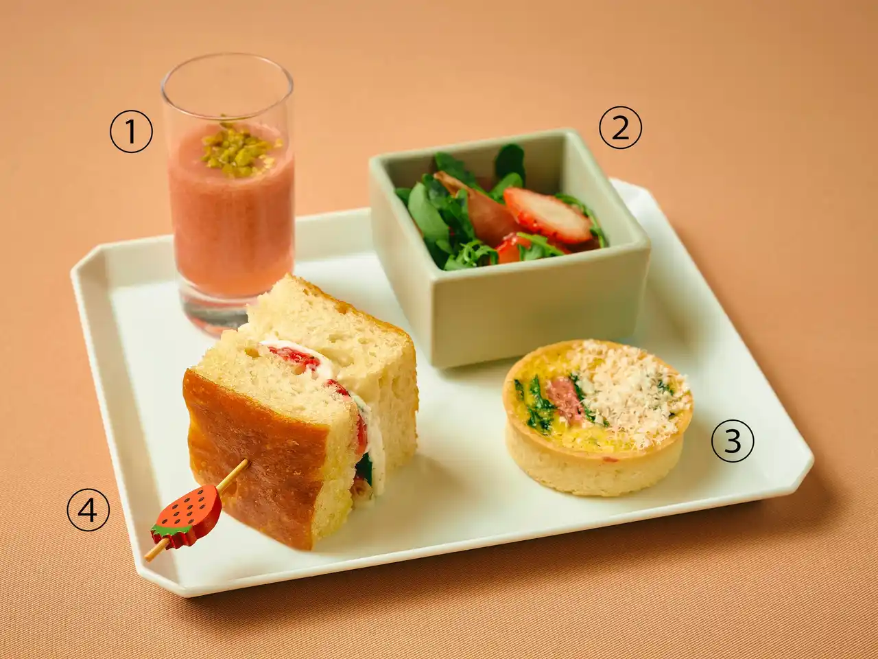 セイボリーでは、イチゴの風味を濃縮した「ストロベリーのガスパチョ」、甘酸っぱいイチゴと濃厚なブッラータチーズの絶妙なマッチングが楽しめる「ストロベリー、ブッラータチーズ、バジルのフォカッチャサンドイッチ」など、一口ごとに春の訪れを感じるラインアップ。 |