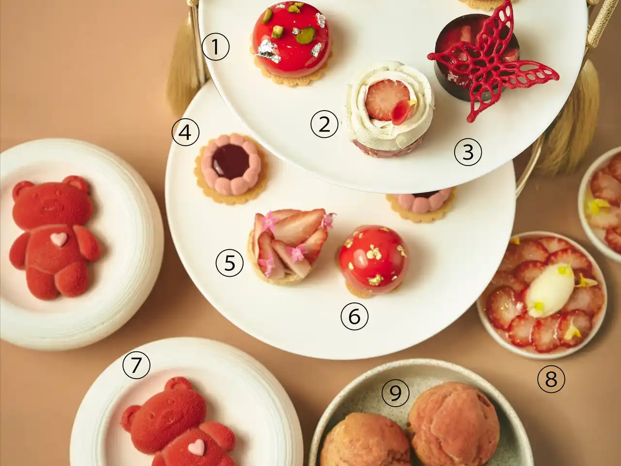 イチゴ本来の甘みが堪能できる「フレッシュストロベリーパイ」、深紅の蝶とチョコレートのコントラストが美しい「チョコレート・ベリータルト」、ローズゼリーとイチゴが奏でる繊細なハーモニーの「イスパハン」など、見た目も味わいも華やかなスイーツが並びます。 |
