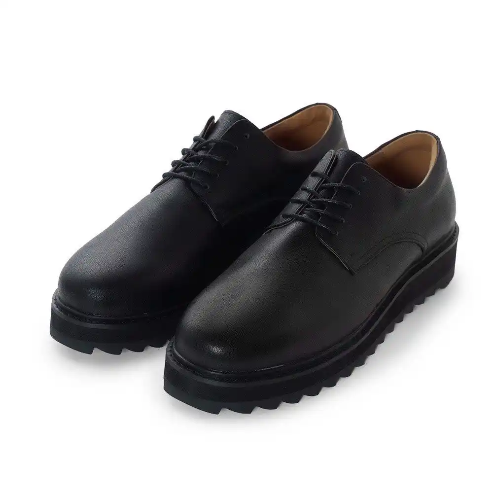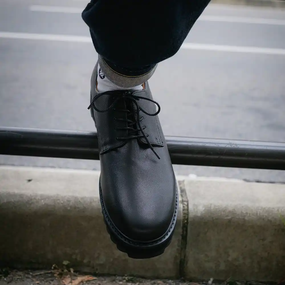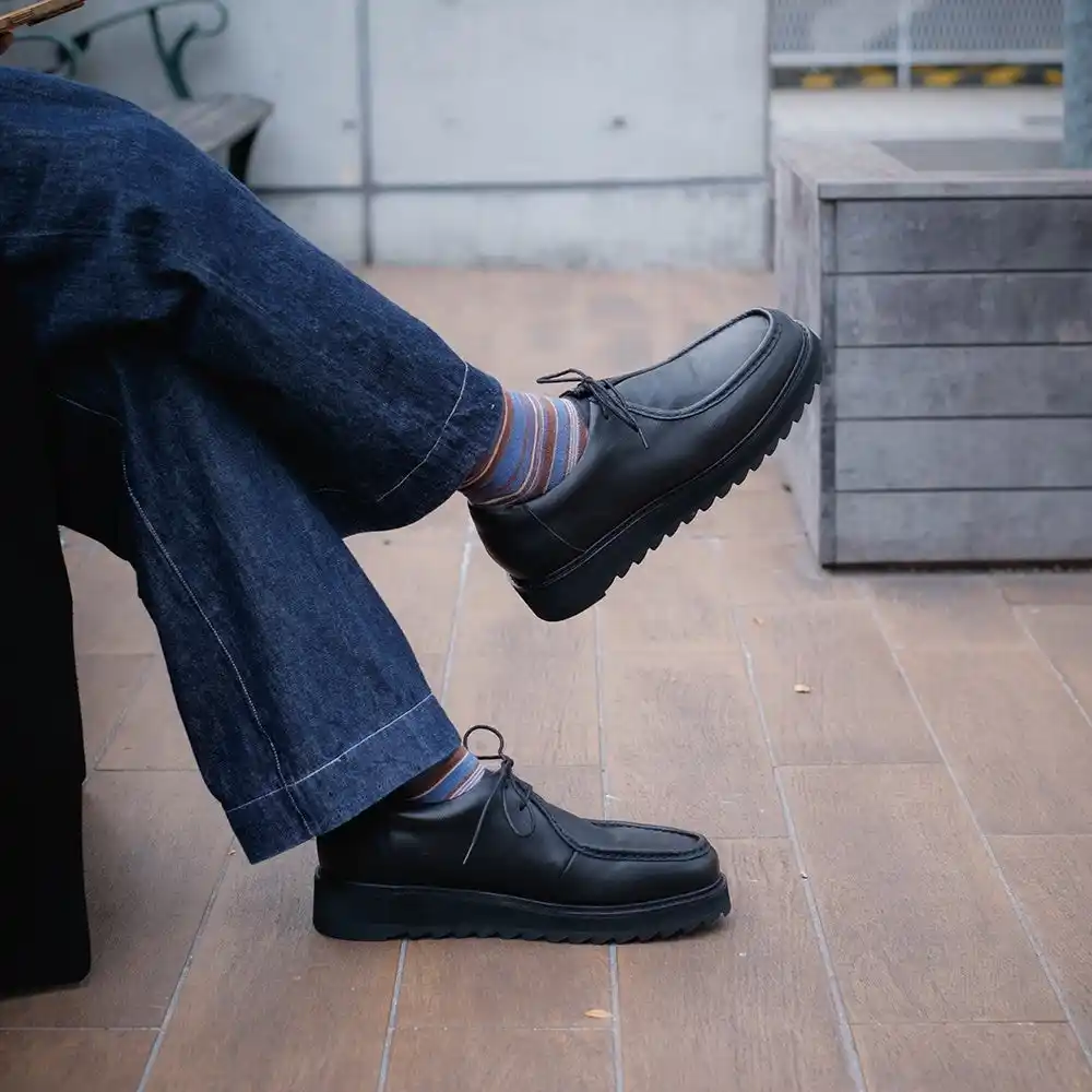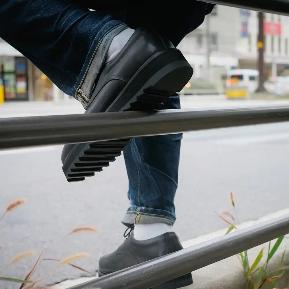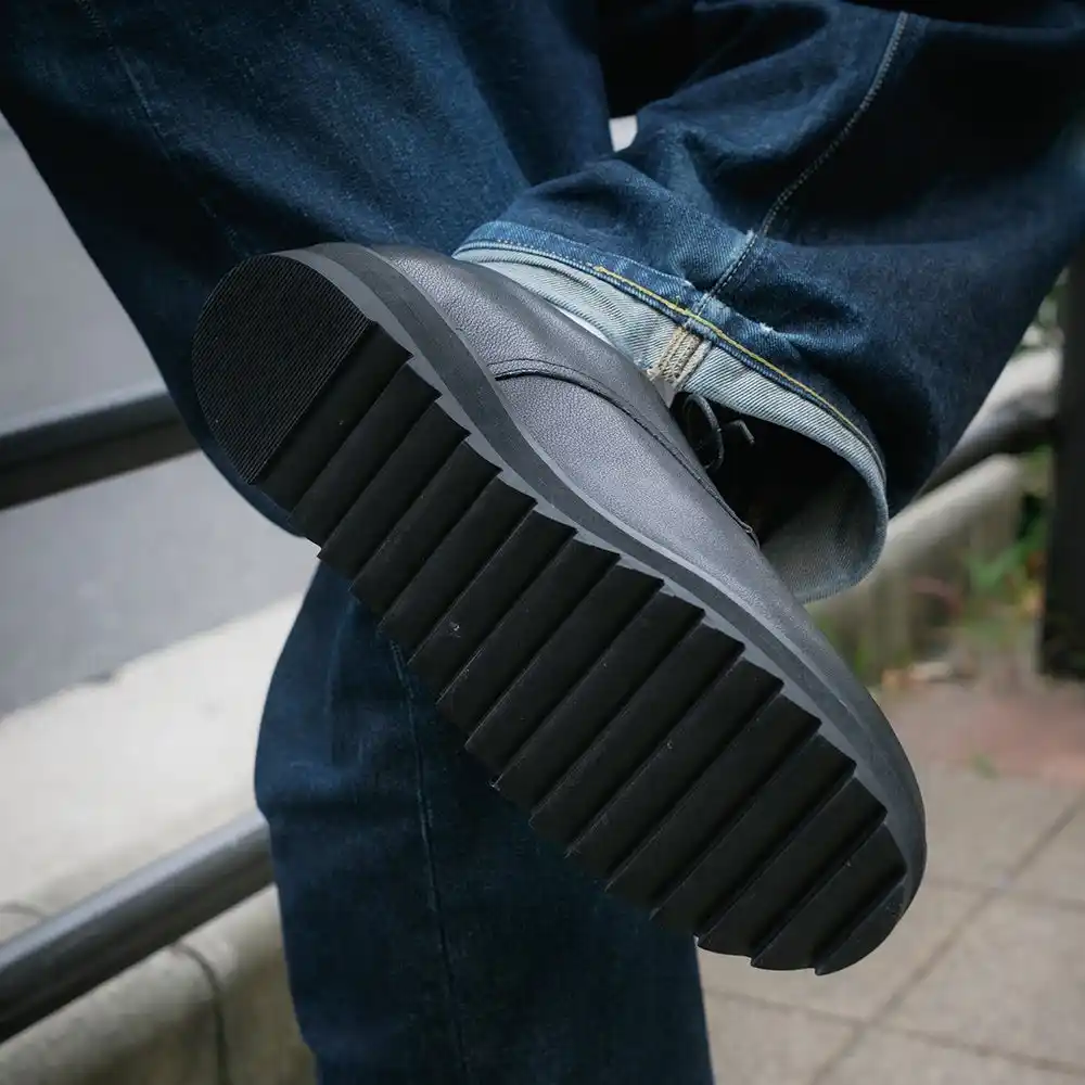 波打つような凹凸を持つリップルソールは、もともとワーク&ミリタリー由来の“滑らないための形状”です。 これをあえて革靴に落とし込むことで、濡れた舗道、ケーブルだらけのスタジオ床、金属階段等で安定したグリップを確保します。 |