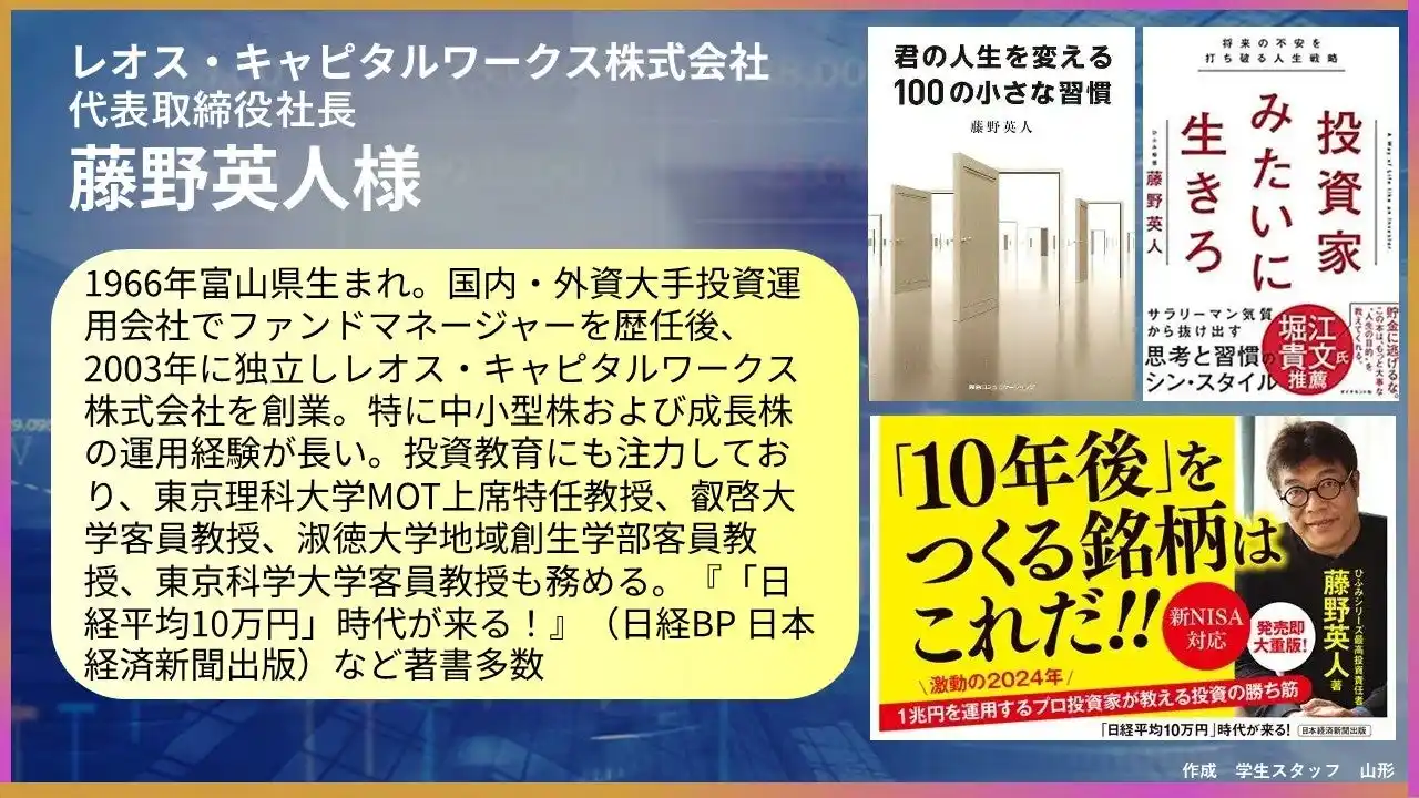 日本では「投資」に対してネガティブなイメージを持つ人が少なくありません。しかし海外では、「投資」という言葉にはポジティブなイメージしかありません。英語の辞書でinvestment(投資)の意味を調べれば、「なにかに多くの時間やエネルギーや情熱などを注ぐこと(when you spend a large amount of time, energy, emotion etc. on something)」「将来のために、今行動したり保有したりすること(something that you do or have in order to have more in the future)」といった説明を読むことができます。なぜこのような違いが生じてしまっているのでしょうか? この講義では、「投資」への誤解を解いてその本質に迫り、さらに投資家的に生きるための方法についてお話します。 |