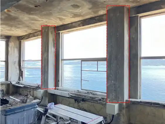 本事業では「チタンロッド内部挿入陽極工法」を用いて、70号棟外壁の外観を極力変化させずに、塩害による外壁内部の鉄筋腐食を抑制することで長期にわたって70号棟の景観を維持します。また、「チタンロッド内部挿入陽極工法」と併せて、流電陽極方式の「パッチガード工法」の2種類の工法を用いて供試体を作製し、島内での屋外暴露試験による長期検証も実施します。 |