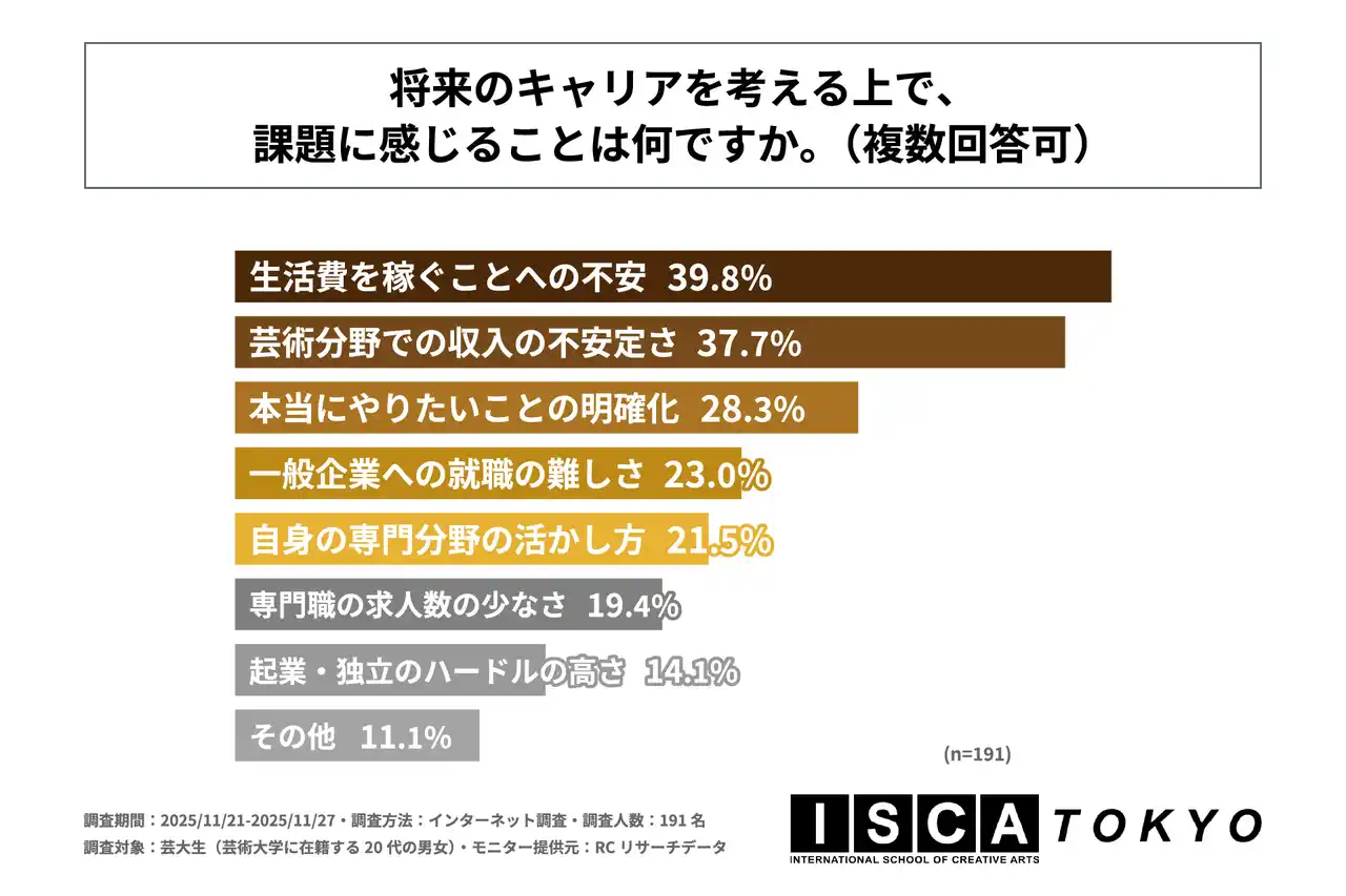芸大生が将来のキャリアに対して感じる課題は、主に「生活費を稼ぐことへの不安」や「収入の不安定さ」といった金銭面の不安 |
