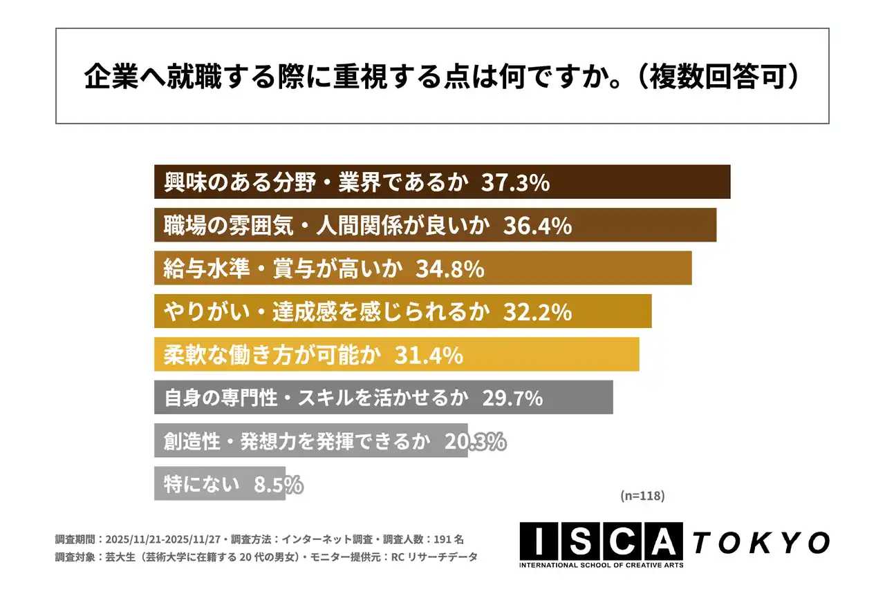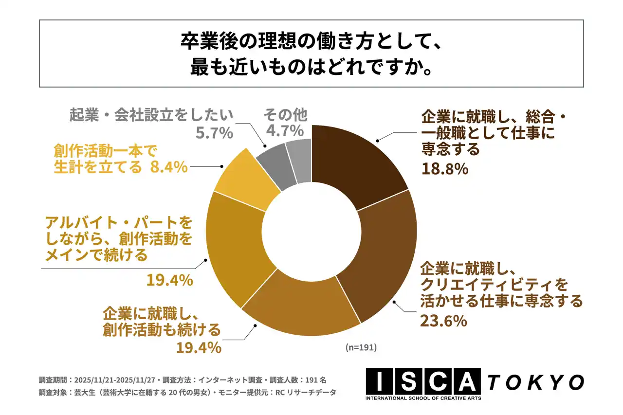 近年、働き方の多様化や経済的な不透明さを背景に、芸術分野を志す学生の間でもキャリアに対する意識変化が起きています。かつてのような「創作活動一本で生計を立てる」という専業志向だけでなく、企業での仕事を通じて安定した収入を得ながら、自身のクリエイティビティを社会で活かしたいと考える学生が増えていると推測されます。しかし、一般的な就職活動に関する調査は多いものの、専門性を持つ芸術大学の学生が、卒業後の「創作」と「生活」のバランスをどのように捉え、どのようなキャリアパスを現実的な選択肢として描いているのか、その実態は十分に明らかになっていません。そこで「ISCA TOKYO」は、芸大生を対象に「芸大生のキャリア意識に関する調査」を実施しました。 |