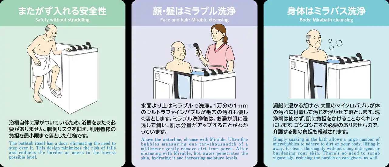 私たちが目指すのは単なる製品販売ではなく、ミラブルテクノロジーを通じて『入浴が健康をつくる』という新しい社会常識を確立し、日本発の技術で現代の日本が抱える超高齢社会課題を解決することです。介護業界の働き方改革を推進し、まずは介護現場から、将来的には一般家庭まで普及させることで、すべての人々がより豊かな生活を送れる社会を実現してまいります。 |