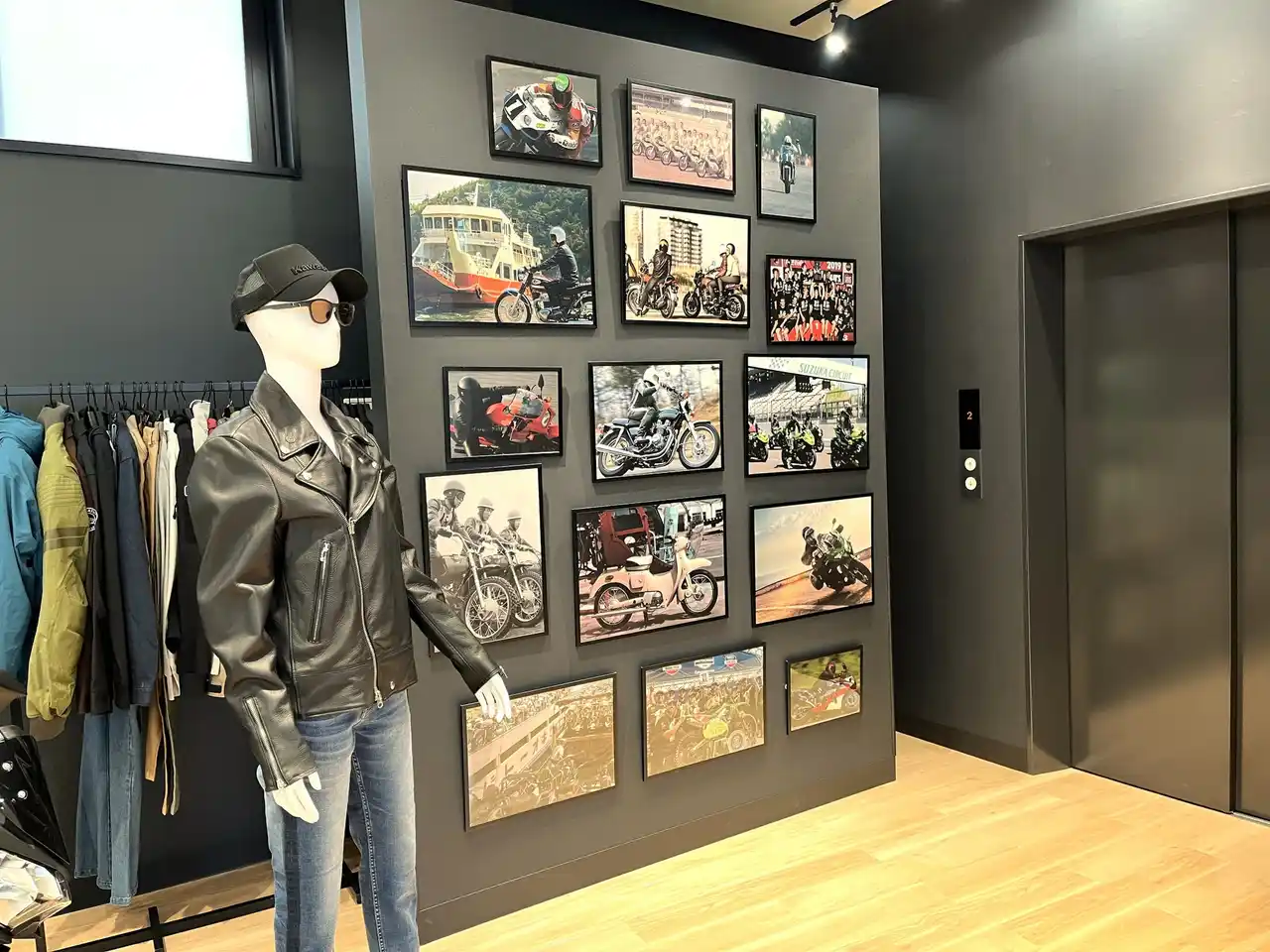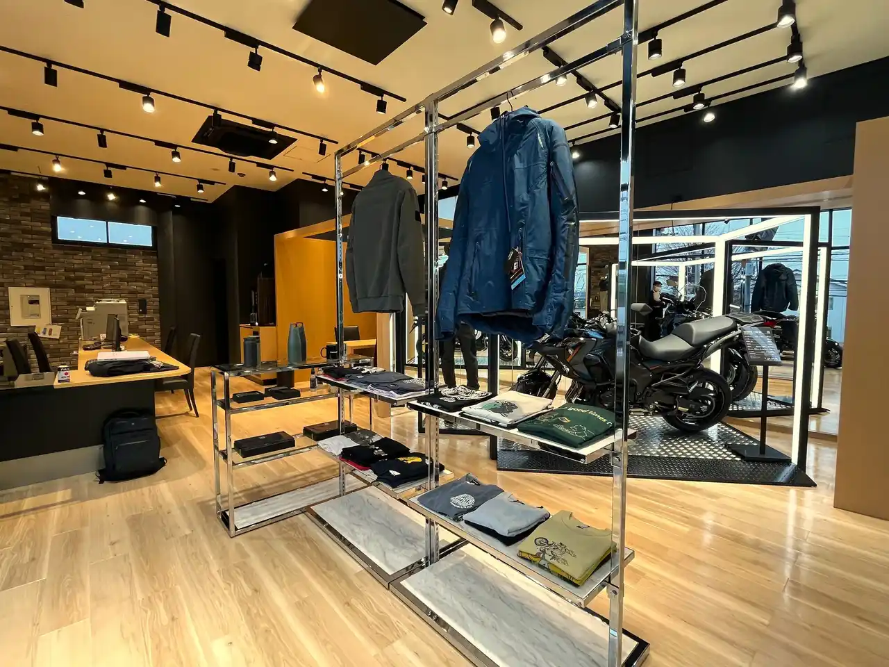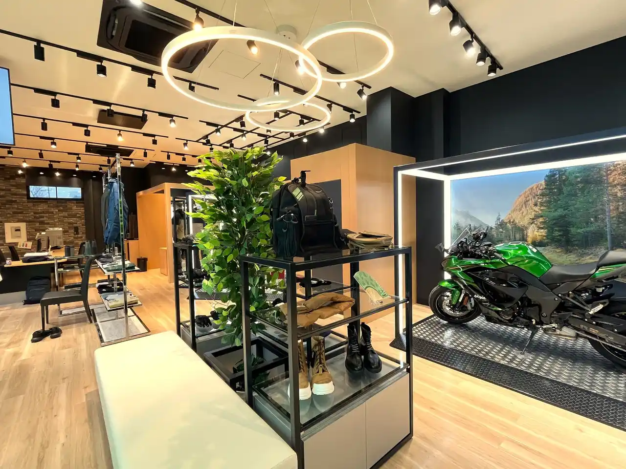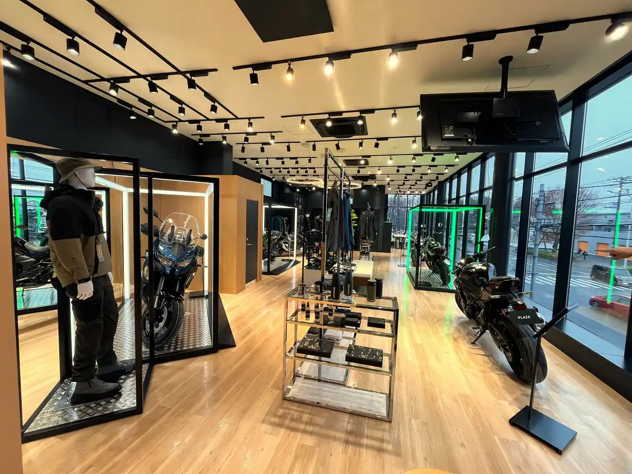 | 木目調のフロアと白い天井が織りなす明るい店内。モーターサイクルとプラザアパレルがゆったりと展示され、どなたでも楽しめる空間となっています。 | ||||||||||||