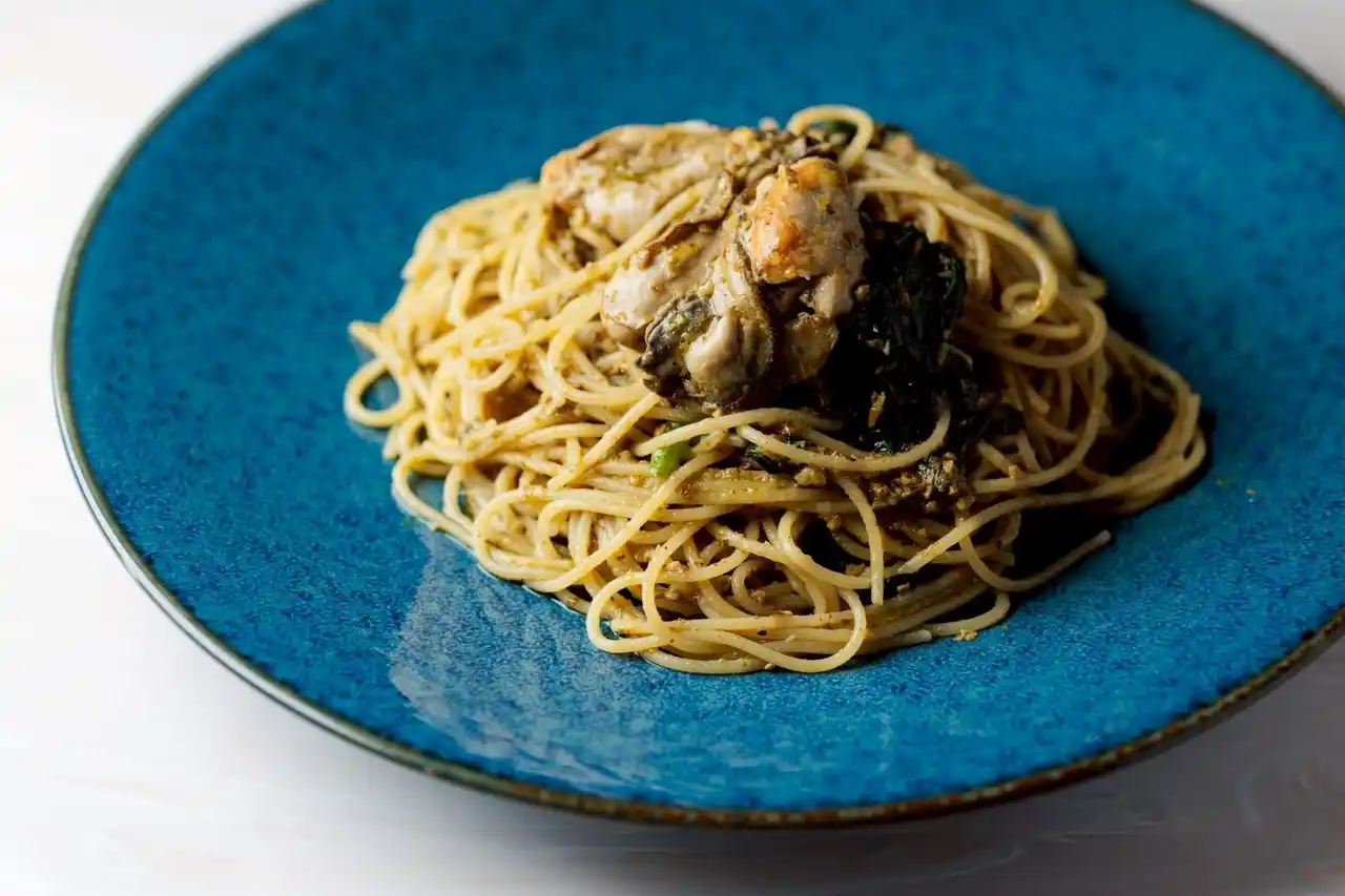 牡蠣とほうれん草のジェノベーゼ 仁淀川山椒のアクセント |