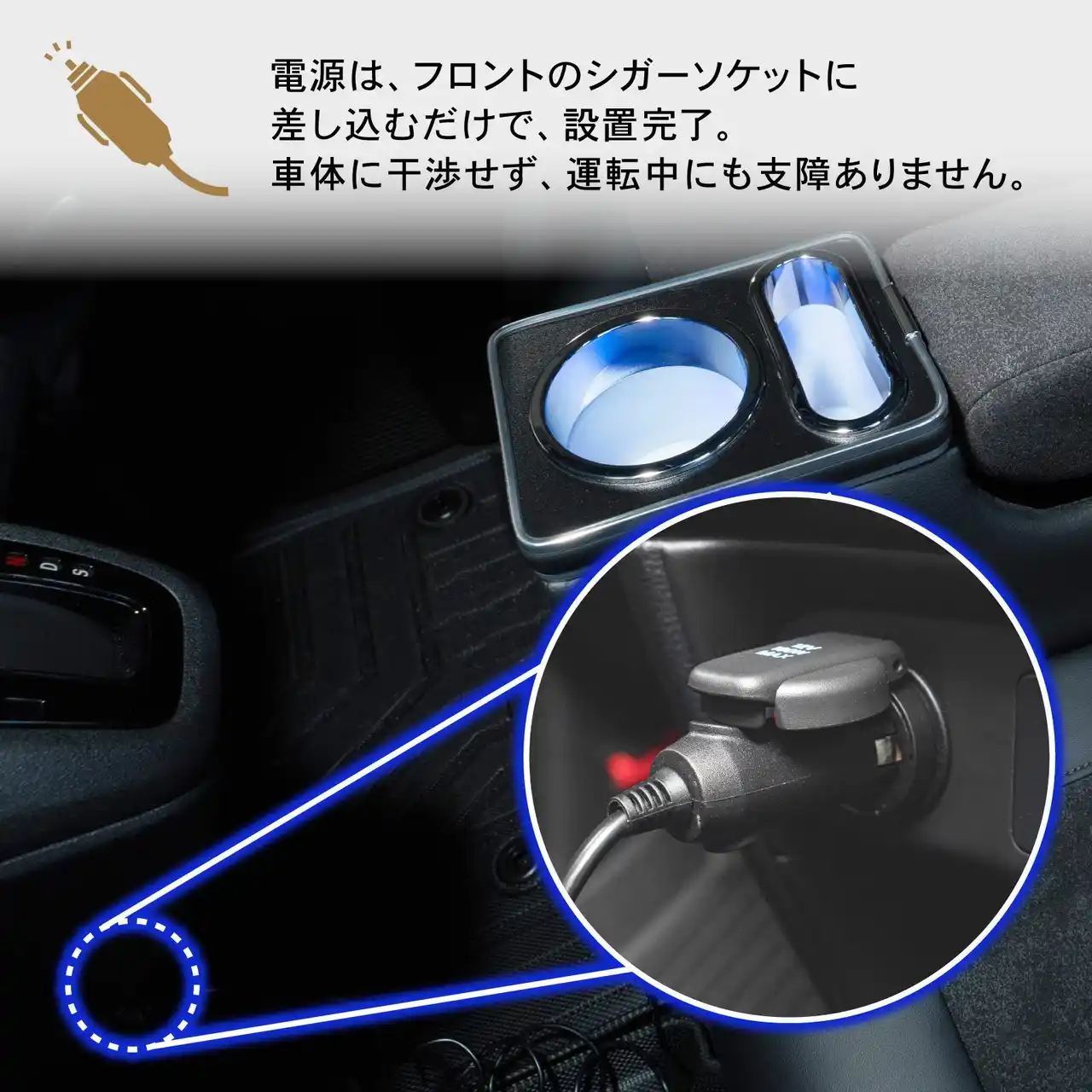 | 電源は、フロントのシガーソケットに差し込むだけで、設置完了。 | |||||||||||||||||||||