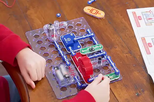 このキットは、パーツを簡単に組み合わせて電子回路を構築できる設計で、大人の助けがなくても取り組みやすく作られています。パーツは色分けされ番号が付いていて、基板にスナップするだけで回路が完成します。
