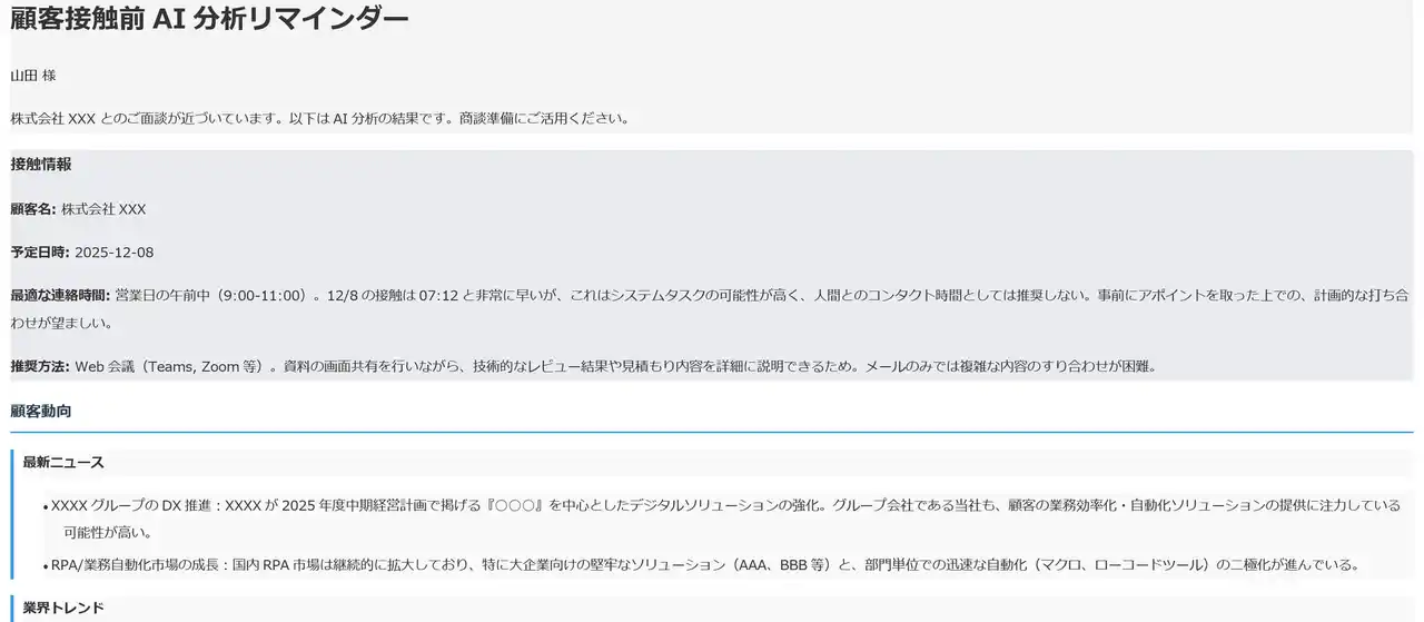 訪問・Web会議・見積提案などの前に、接触履歴・顧客情報・業界ニュース・トレンドをAIが解析し、 商談に最も効果的な準備内容をまとめてリマインドします。 |