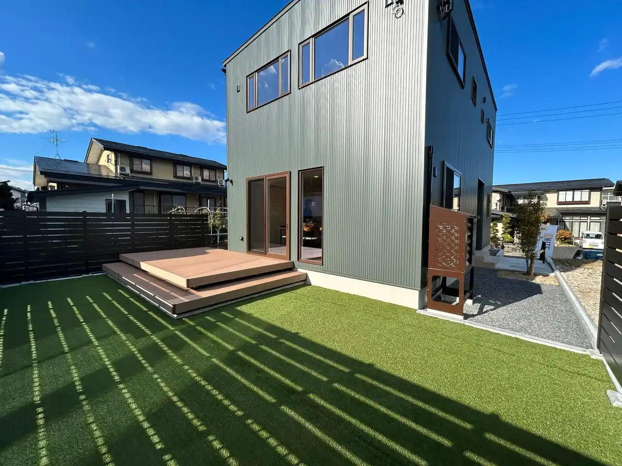 ・BBQや水遊びも楽しめる人工芝+人工木材デッキの庭空間 |