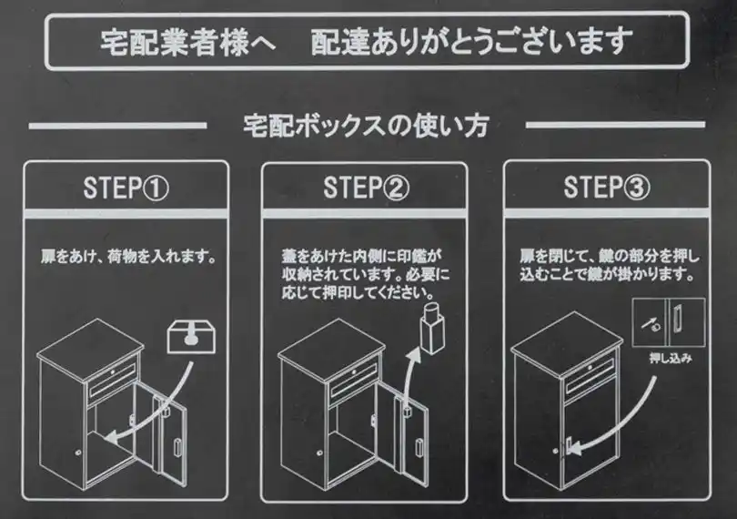 | また、配達員の方が荷物を入れてから施錠まで迷わず使えるメッセージプレートと、受領印の押印に便利な印鑑ホルダーを付属しており、外出時にも受取人・配達員双方にとってスムーズな荷物の受け取りをサポートします。 | |||||||||
