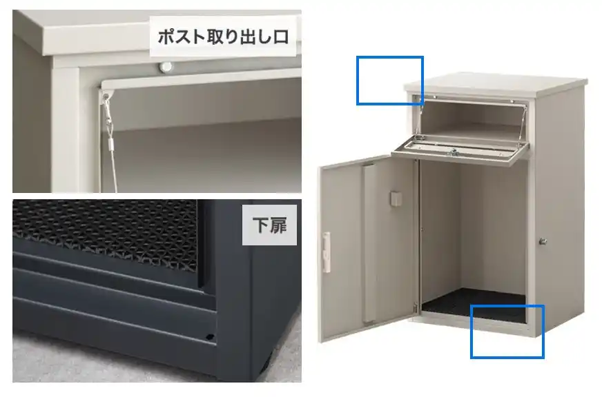 | 扉の内側部分には段差構造を採用し、雨水やほこりが内部へ侵入しにくい防水設計となっています。防サビ・防塵設計で、屋外環境でも安心して使用でき、より長くお使いいただくことが可能です。 | |||||||||