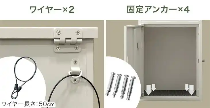 | 安心・安全面としては、ワイヤーおよびアンカー固定の両方に対応しており、設置環境に合わせた設置が可能です。 | |||||||||
