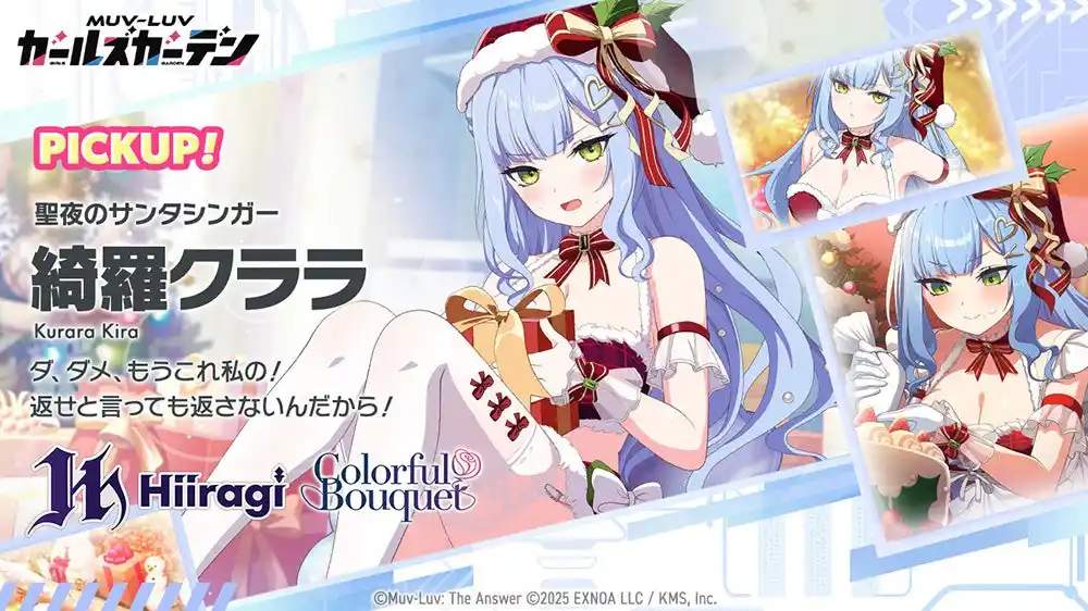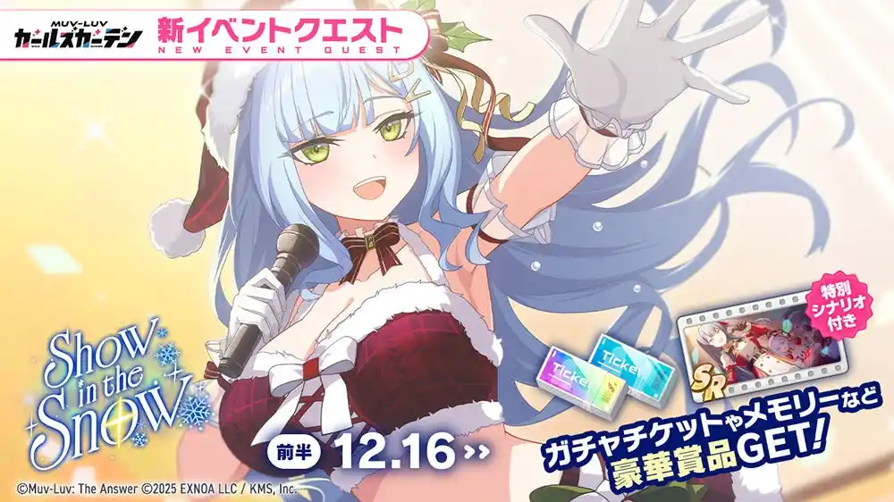 合同会社EXNOA(本社:東京都港区、CEO:東條 寛、URL:https://games.dmm.com/)と株式会社KMS(本社:東京都品川区、代表:梶原 健太郎、URL:http://kms3.com/)が贈るマブラヴ最新作『マブラヴ ガールズガーデン』(以下、マブガル)が12月15日(月)より、公式Discordにてクリスマスアドベントカレンダーキャンペーンを開催中です。また、ゲーム内では新イベント【Show in the Snow】後半を開催し、新衣装の「綺羅クララ」【聖夜のサンタシンガー】が登場しました。 |