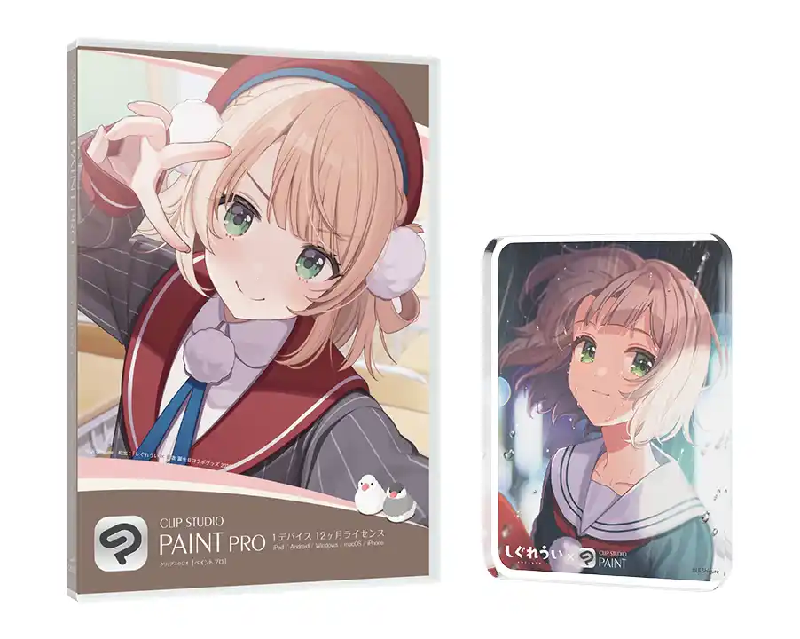 | 会場ではコラボを記念して、しぐれうい先生のアクリルブロックがセットになった「CLIP STUDIO PAINT PRO 1デバイスプラン12ヶ月版 コラボパッケージ」を販売します。 | ||||||||||||||||