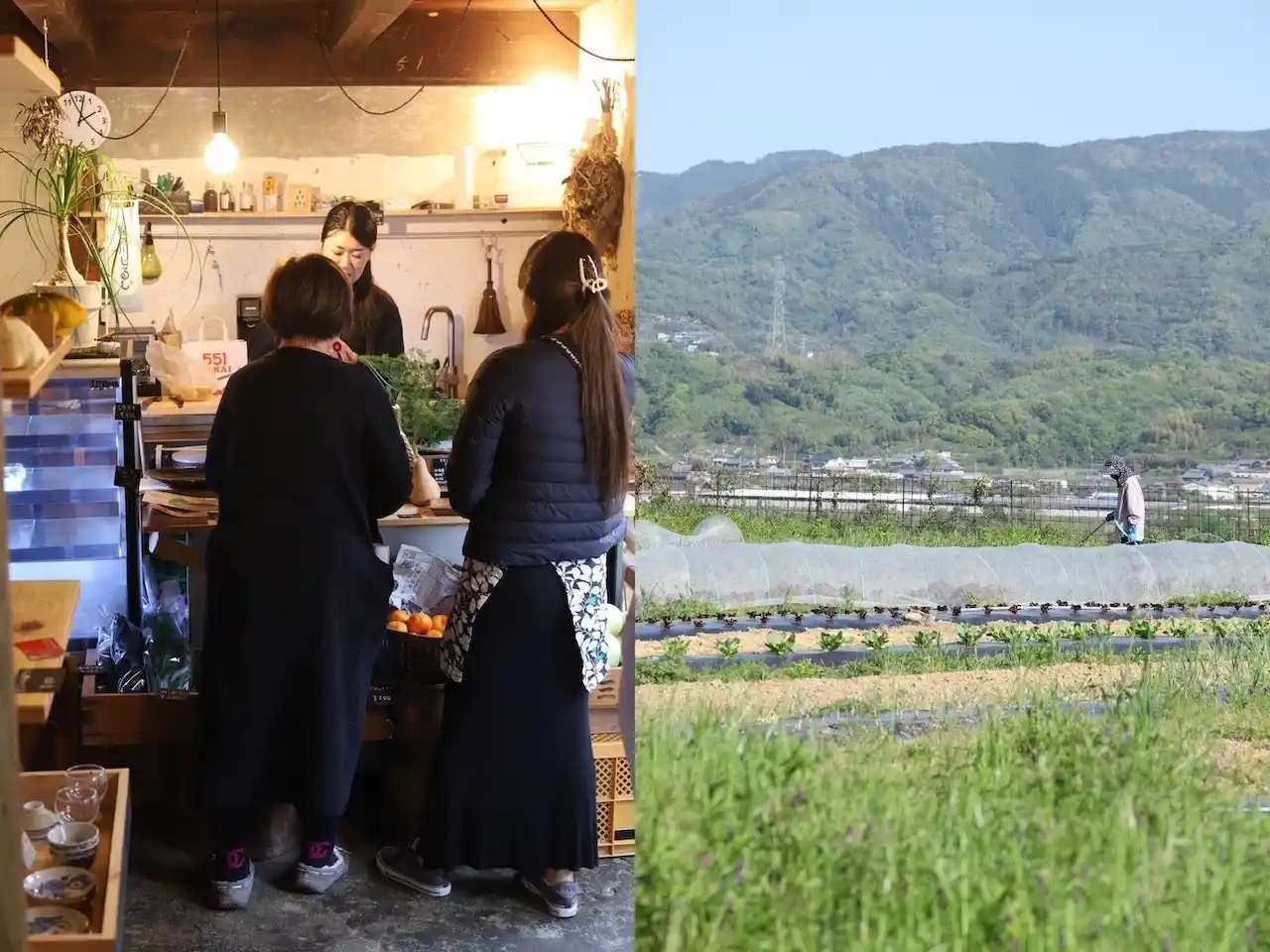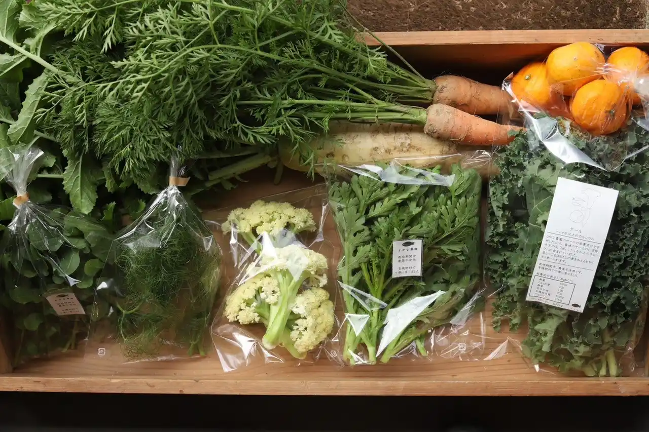滝から水を引き、農薬を使わず有機質肥料のみを使って、ケールをはじめとする西洋野菜などを栽培しています。2023年には、それらの生産物と、ベーグルやジビエなどを販売する「さかなストア」もオープンしました。 |