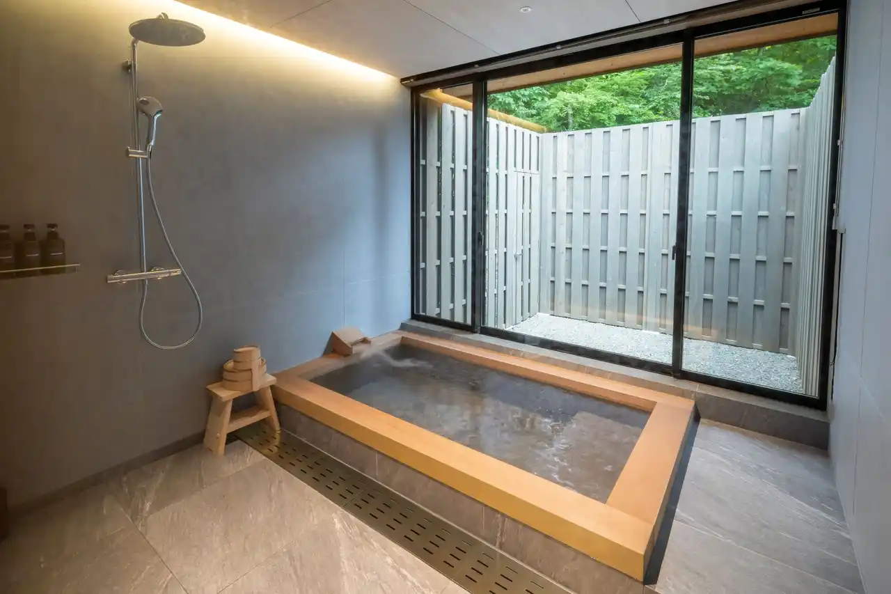また、大正3年創業の温泉旅館「俵石閣」を改装し、歴史ある数寄屋造りを残した「料亭 俵石」の対面に立つ4つのヴィラでは、文化人や多くの人々に愛された俵石閣が紡いだ時間を、宿泊を通して体験できます。庭の木々の風景の中に溶け込む、長く伸びた軒を持つ平屋屋根の建物になっており、洗練された空間の客室からは、近景に豊かな庭を楽しむことができ、その先には俵石閣を望むことができるようになっています。 |