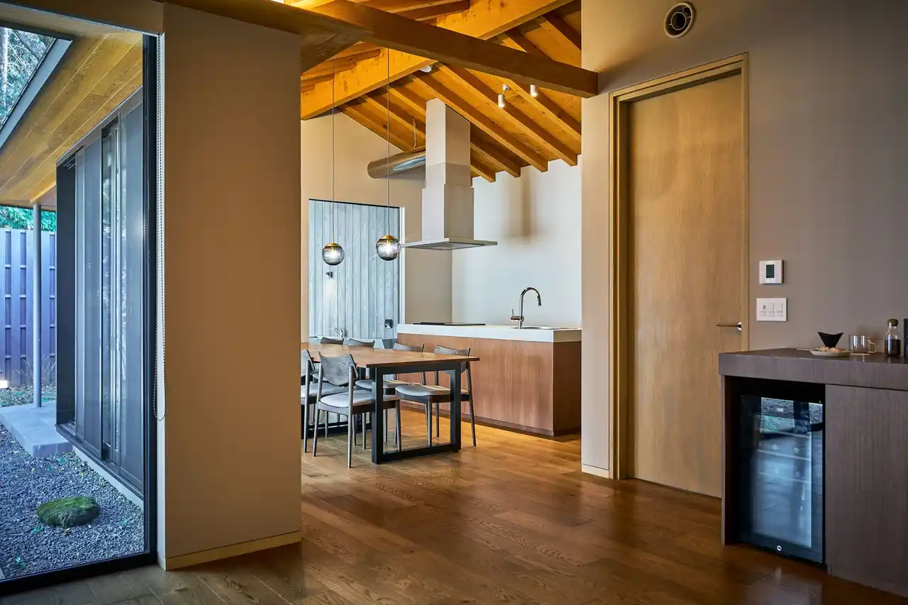 特筆すべきは開口部の設け方である。既存のヴィラや隣棟との視線の交差を丁寧に避けながらも、庭や森の景観が最も美しく望める方向を的確に切り取っており、内部に居ながら自然に包まれる感覚を得られる。こうした巧みな設計によって、各棟は適度な距離感とプライバシーを守りつつ、風景とつながる安らぎを実現している。(出典元:グッドデザイン賞 公式サイトより) |