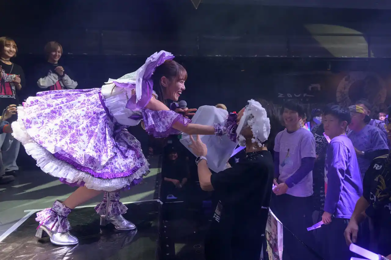 ver.-』が披露されると会場は大熱狂。曲の最高潮では誕生日サプライズが展開され、寝不足気味の吉田尚記に贈られたのは“よく眠れるパジャマ”。さらに顔面へのパイ投げというユーモラスな演出に加え、れにさんへの“パイ返し”という予想外の展開で会場は笑いと歓声に包まれました。観客全員が誕生日を祝福し、吉田さんは「歳をとるのは悪いことじゃない」「れにちゃんを見ているだけで寿命が伸びる」と感無量の様子を見せ、「これでまた20年は生きられる」と笑顔で語り、幸せに満ちた夜を締めくくりました。 |