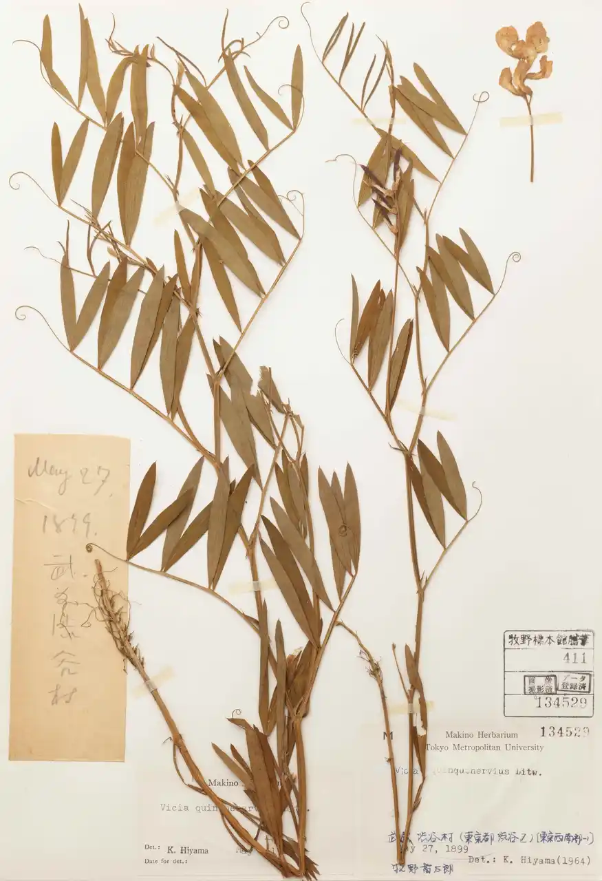 ◀1899年渋谷で採集された「レンリソウ」の標本(東京都立大学牧野標本館所蔵) |