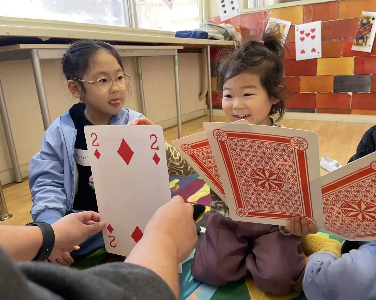 ゲームでは、大きなトランプで、ババ抜きや神経衰弱などの定番ゲームを楽しみました。グループのお友だちと協力しながら、”Next!” などと英語でやり取りする姿が印象的でした。 |