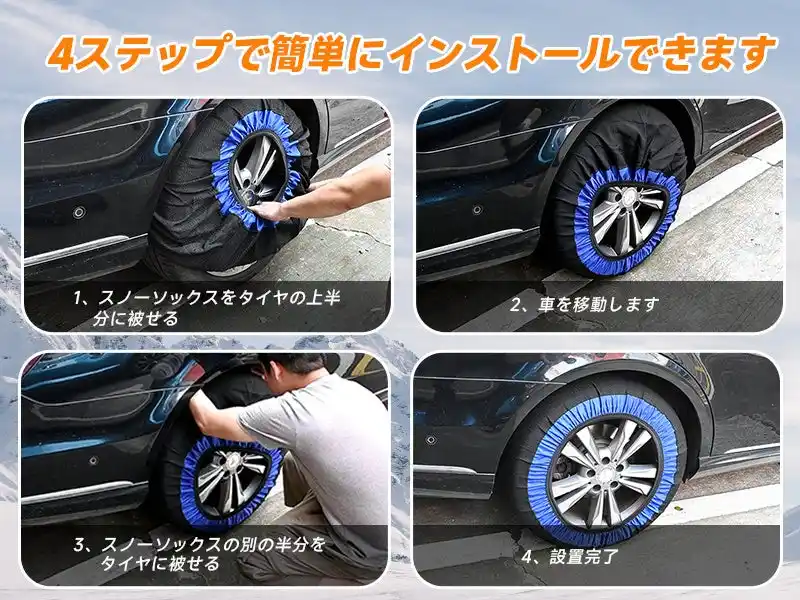 重い金属チェーンを組み立てる時代は終わりました。本品は、まるでタイヤに「靴下」を履かせるだけの簡単装着。ジャッキを使わず、工具も不要。寒い中、手を汚すことなく、たった3分で準備完了です。力に自信のない方、女性ドライバーでも安心してご使用いただけます。 |
