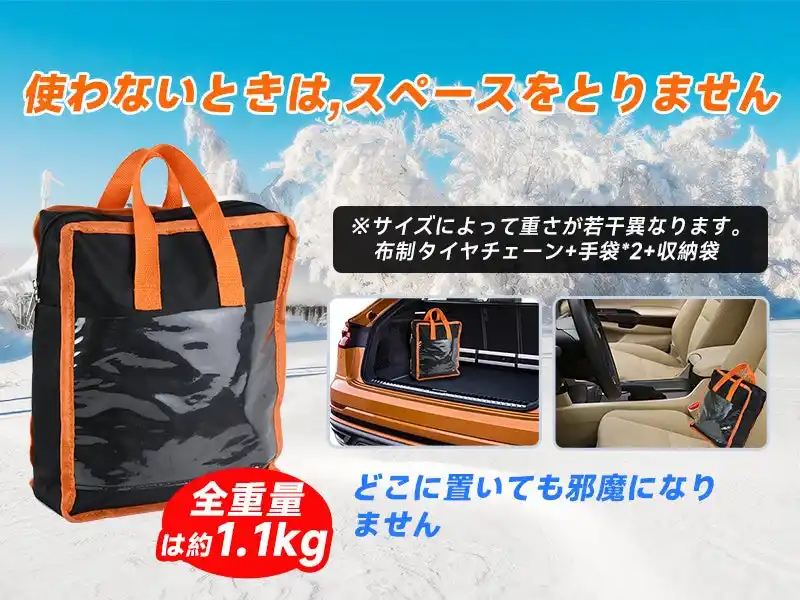 従来の金属チェーンと比べて驚くほどコンパクト。専用収納パックにスッキリ収まり、トランクの片隅に置いても場所を取りません。「いざという時」のために、常備しておける手軽さが魅力です。 梱包サイズ:24cm*28cm*11cm 重量:約1.1kg