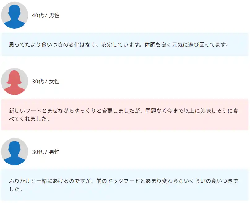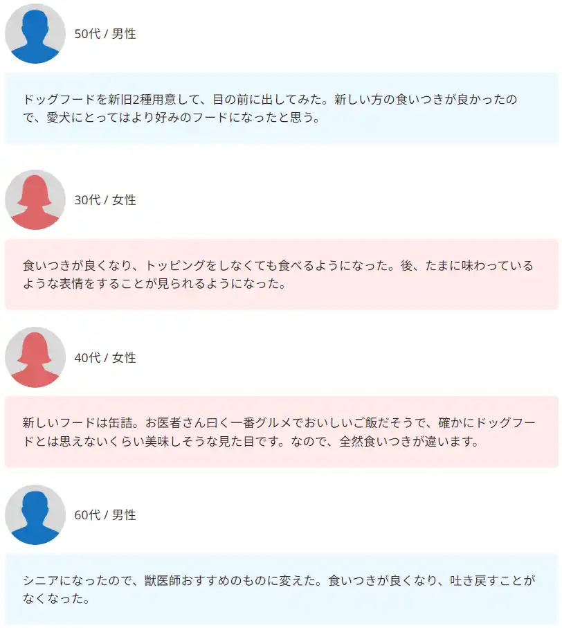 | 「食いつきが良くなった」という声からは、食事が待ち遠しい時間になった喜びが伝わってきます。 | ||||||||||||